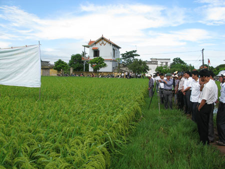 Các Chủ nhiệm HTX DVNN của 35 xã, thị trấn (Tiền Hải) tham quan, học tập mô hình trồng lúa “3 giảm, 3 tăng” và kỹ thật SRI tại xã Đông Quý.