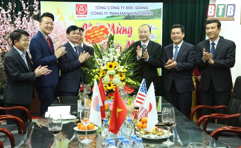 Các đồng chí lãnh đạo tỉnh tặng hoa đầu xuân cho công ty TNHH May Hưng Nhân. Ảnh: Thành Tâm