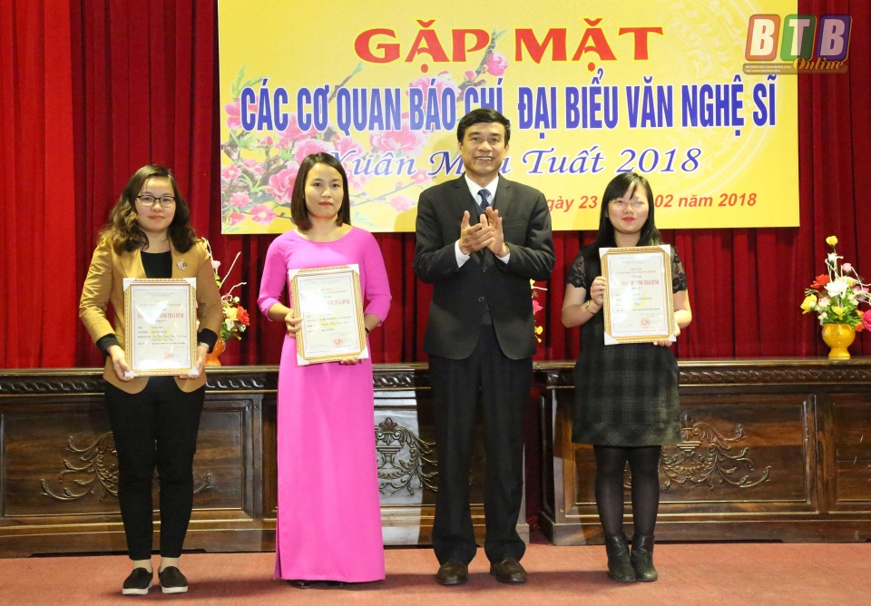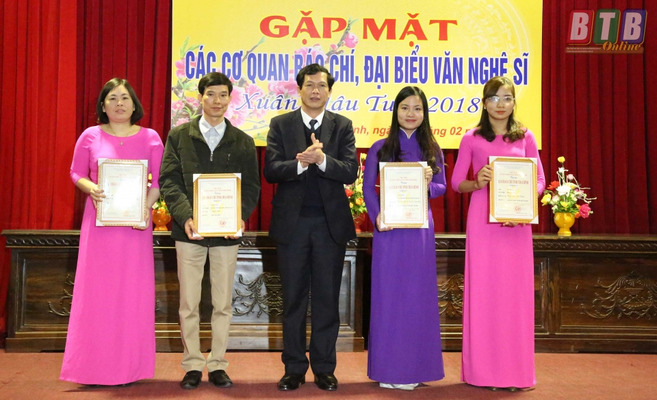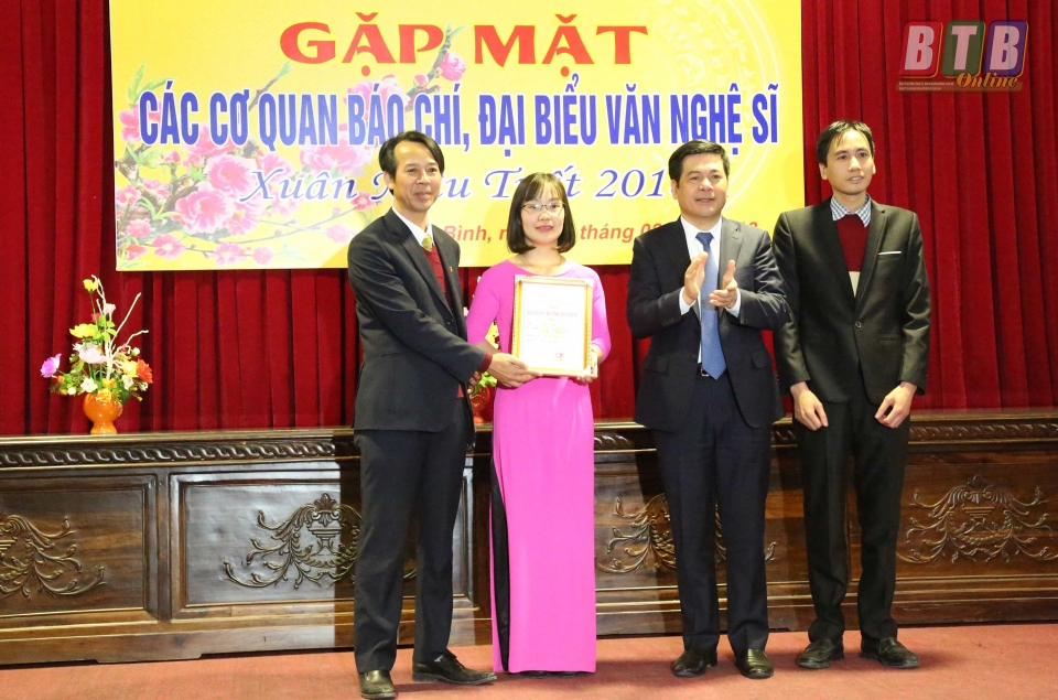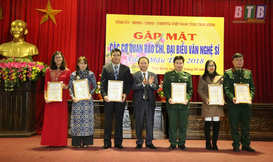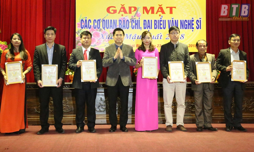 Cũng tại buổi gặp mặt, các đồng chí lãnh đạo tỉnh đã trao giải cho các tác giả đạt Giải Báo chí tỉnh Thái Bình năm 2017. Là năm thứ 6 tổ chức, Giải Báo chí tỉnh ngày càng thu hút đông đảo những người làm báo chuyên và không chuyên tham gia, tạo cơ hội cho những người làm báo được thể hiện tài năng, trí tuệ, sự nhiệt huyết trong quá trình làm báo. Ban tổ chức Giải Báo chí tỉnh Thái Bình năm 2017 đã lựa chọn được 23 tác phẩm của 23 tác giả, nhóm tác giả để trao giải trong đó có 1 giải nhất, 3 giải nhì, 4 giải ba, 15 giải khuyến khích. Tác phẩm “Tích tụ ruộng đất, phương thuốc vàng tạo sinh khí trên cánh đồng” đạt giải nhất. Các tác phẩm “Sơn tinh thời @”, “Đi tìm thương hiệu gạo Thái Bình”, “Viết tiếp truyện cổ tích” đạt giải nhì…