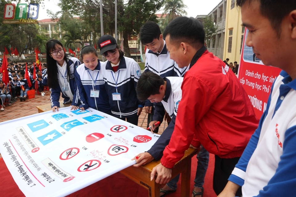 Học sinh Trường THPT Quỳnh Côi (Quỳnh Phụ) thực hành tìm hiểu Luật ATGT.