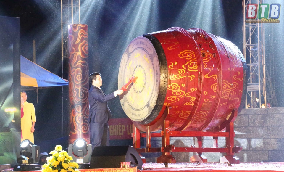 Đồng chí Nguyễn Hồng Diên, Ủy viên Trung ương Đảng, Phó Bí thư Tỉnh ủy, Chủ tịch UBND tỉnh đánh trống khai hội đền Trần Thái Bình năm 2018.