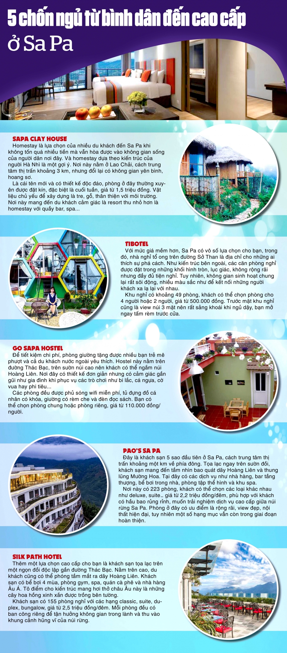 Với loạt khách sạn 5 sao mới và nhiều homestay xinh xắn, Sa Pa đáp ứng đủ nhu cầu nghỉ ngơi từ sang trọng đến bình dân.
