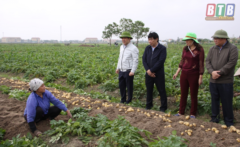 Kiểm tra tiến độ thu hoạch khoai tây vụ xuân tại thôn Ngô Xá, xã Nguyên Xá, đồng chí Chủ tịch UBND tỉnh yêu cầu Sở Nông nghiệp và Phát triển nông thôn phối hợp với UBND huyện Vũ Thư chủ động tìm kiếm đầu ra để tiêu thụ sản phẩm cho bà con nông dân, tránh tình trạng được mùa, mất giá.