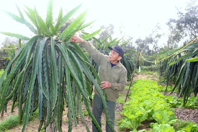 Ông Tùng chia sẻ: “Mùa đông thanh long không cho quả nên tôi trồng xen các giống cây rau phía gốc để tăng thêm thu nhập. Năm vừa qua, tính ra thu về hơn 70 triệu đồng từ khu vườn này. Cũng không phải vì xã xây dựng nông thôn mới mới làm vườn mẫu mà quan trọng là mình vừa làm, vừa hưởng thụ, làm cho mình trước, mình hưởng trước”.