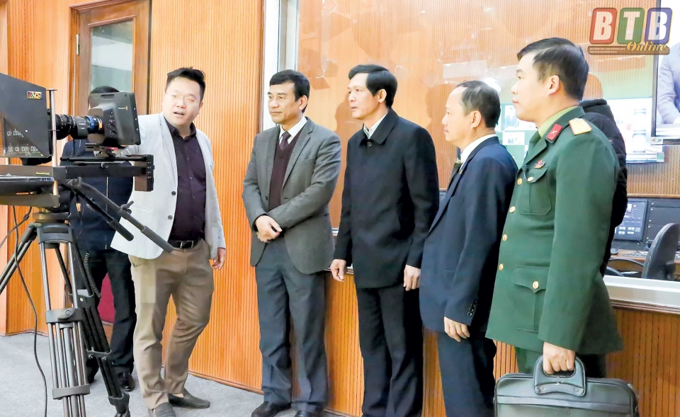 Các đồng chí: Đặng Trọng Thăng, Phó Bí thư thường trực Tỉnh ủy, Chủ tịch HĐND tỉnh; Nguyễn Hồng Chuyên, Ủy viên Ban Thường vụ Tỉnh ủy, Trưởng ban Tuyên giáo Tỉnh ủy thăm trường quay Báo Thái Bình điện tử. Ảnh: Thành Tâm