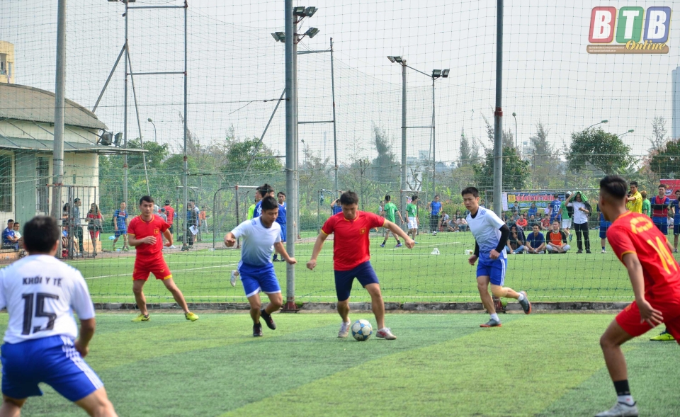 Một pha bóng trong trận thi đấu giữa đội cụm Tổng hợp và đội cụm Y tế.
