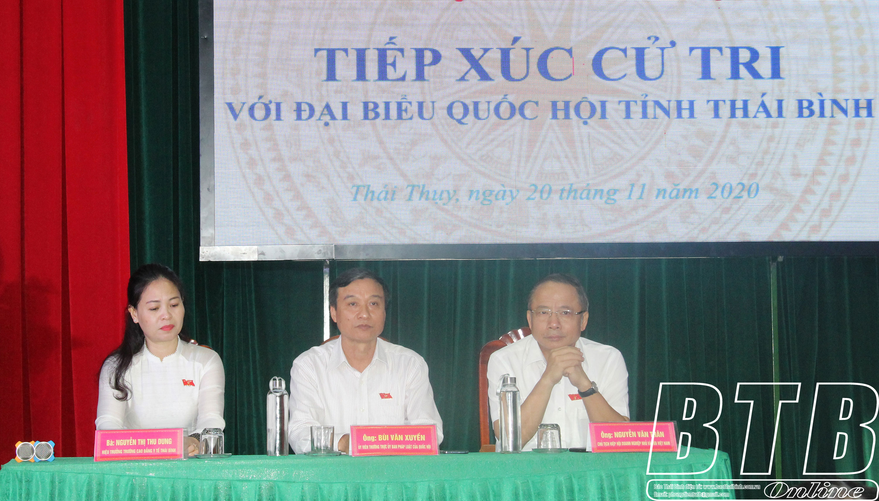 Dự hội nghị tiếp xúc có các đại biểu: Nguyễn Hạnh Phúc, Ủy viên Trung ương Đảng, Tổng thư ký, Chủ nhiệm Văn phòng Quốc hội; Bùi Văn Xuyền, Ủy viên thường trực Ủy ban Pháp luật của Quốc hội; Phạm Văn Tuân, Ủy viên Ban Thường vụ Tỉnh ủy, Trưởng đoàn Đại biểu Quốc hội tỉnh, Trưởng ban Tổ chức Tỉnh ủy; Nguyễn Văn Thân, Chủ tịch Hiệp hội Doanh nghiệp vừa và nhỏ Việt Nam; Vũ Tiến Lộc, Chủ tịch Phòng Thương mại và Công nghiệp Việt Nam; Bùi Quốc Phòng, Phó Chủ tịch Hội Cựu chiến binh tỉnh; Nguyễn Thị Thu Dung, Hiệu trưởng Trường Cao đẳng Y tế Thái Bình.