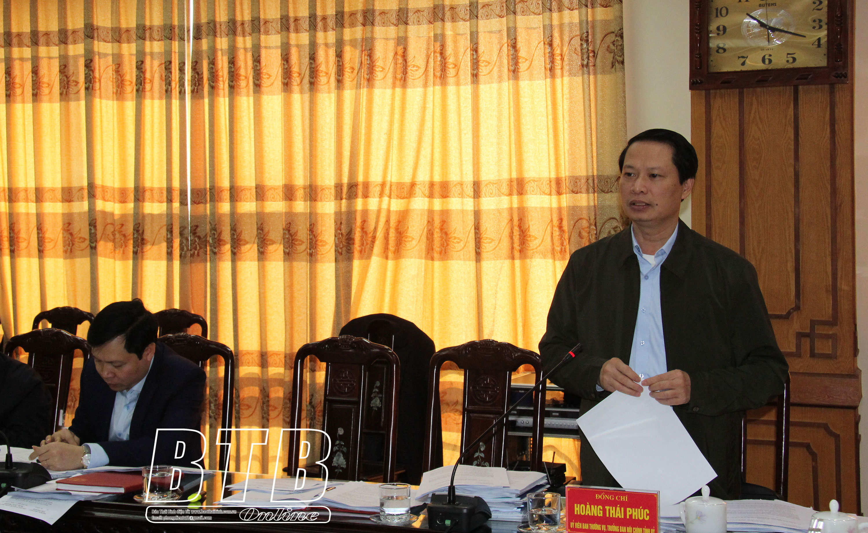 Đồng chí Hoàng Thái Phúc, Ủy viên Ban Thường vụ, Trưởng ban Nội chính Tỉnh ủy kiêm Trưởng ban Pháp chế HĐND tỉnh phát biểu tại cuộc họp.