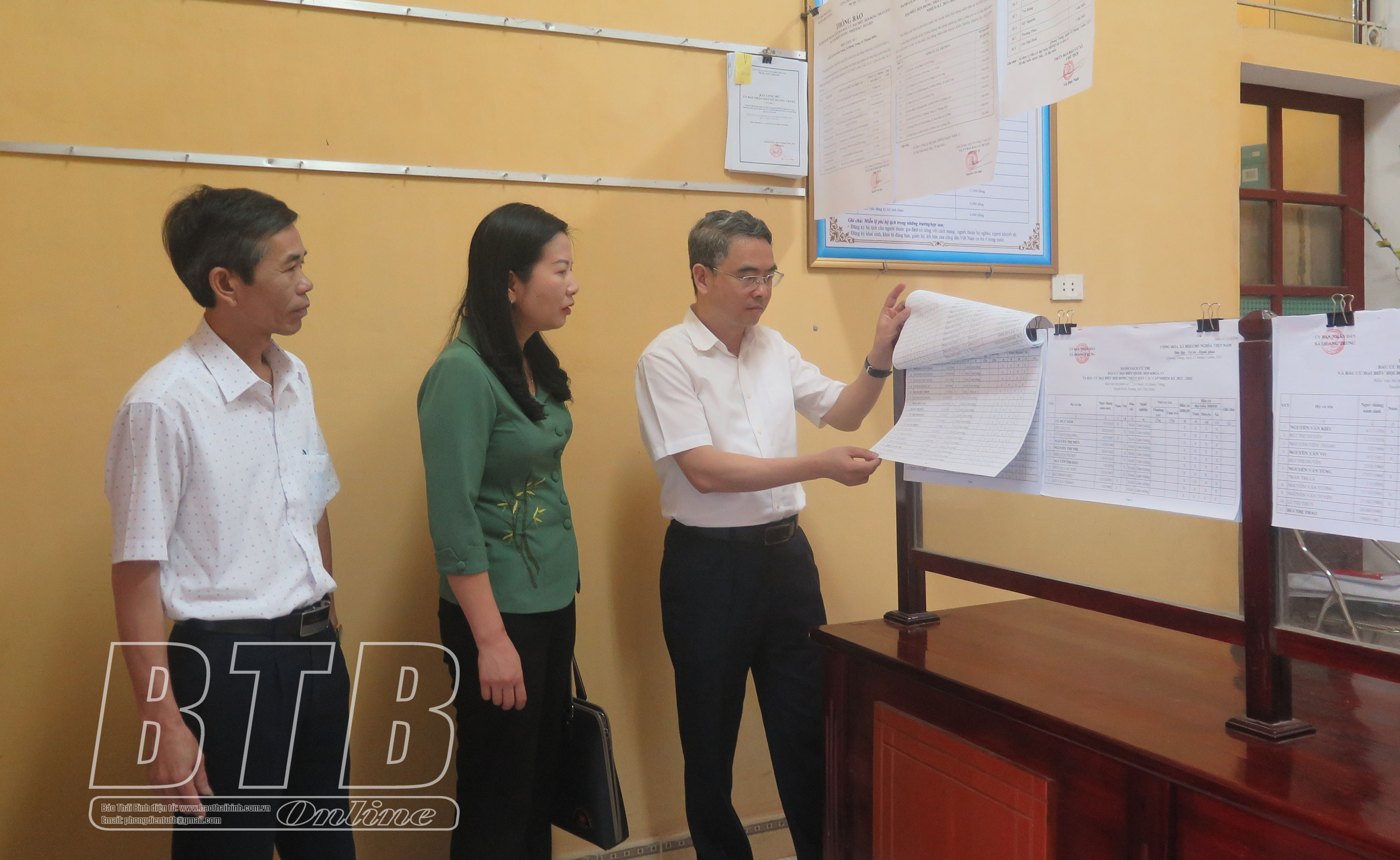 Đồng chí Phạm Đồng Thụy, Ủy viên Ban Thường vụ, Trưởng ban Tuyên giáo Tỉnh ủy, Ủy viên Ủy ban bầu cử tỉnh cùng các thành viên trong đoàn kiểm tra danh sách cử tri tại xã Quang Trung.