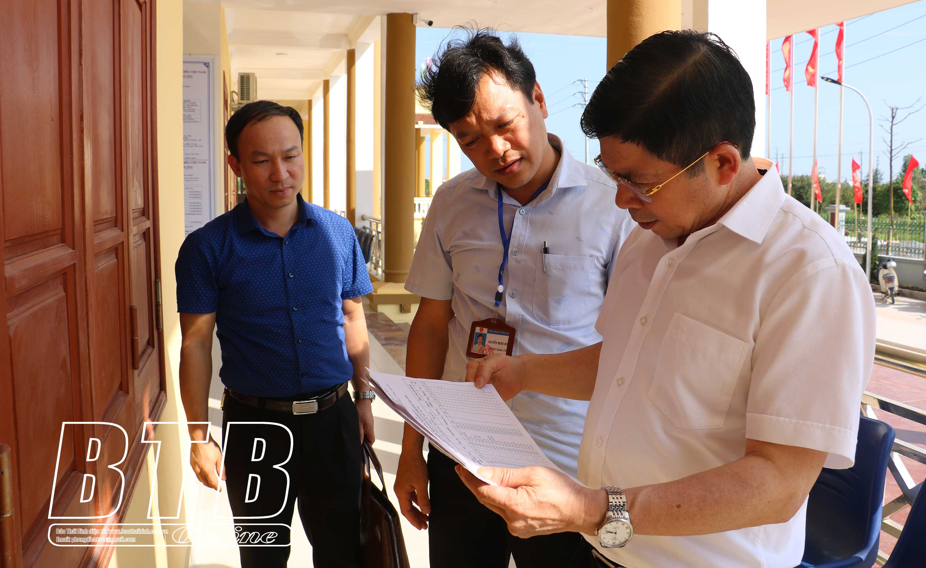 Đồng chí Phạm Văn Tuân, Ủy viên Ban Thường vụ, Trưởng ban Tổ chức Tỉnh ủy, Trưởng đoàn đại biểu Quốc hội tỉnh kiểm tra danh sách cử tri tại thị trấn Tiền Hải.