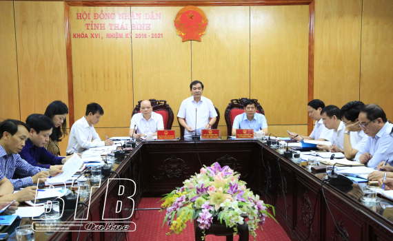 Các đồng chí: Nguyễn Tiến Thành, Phó Bí thư thường trực Tỉnh ủy, Chủ tịch HĐND tỉnh; Đặng Thanh Giang, Ủy viên Ban Thường vụ Tỉnh ủy, Phó Chủ tịch thường trực HĐND tỉnh; Vũ Mạnh Hiền, Phó Chủ tịch HĐND tỉnh chủ trì cuộc họp.