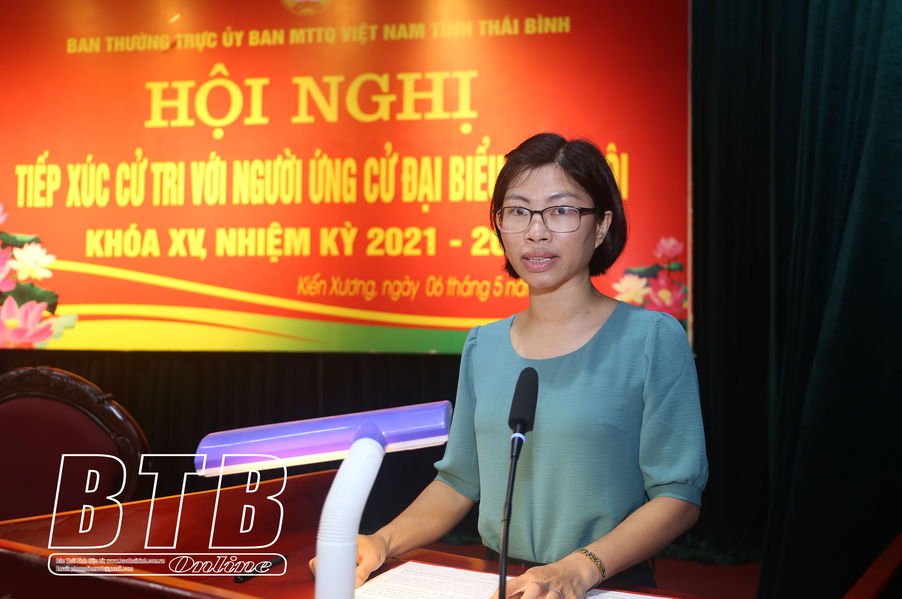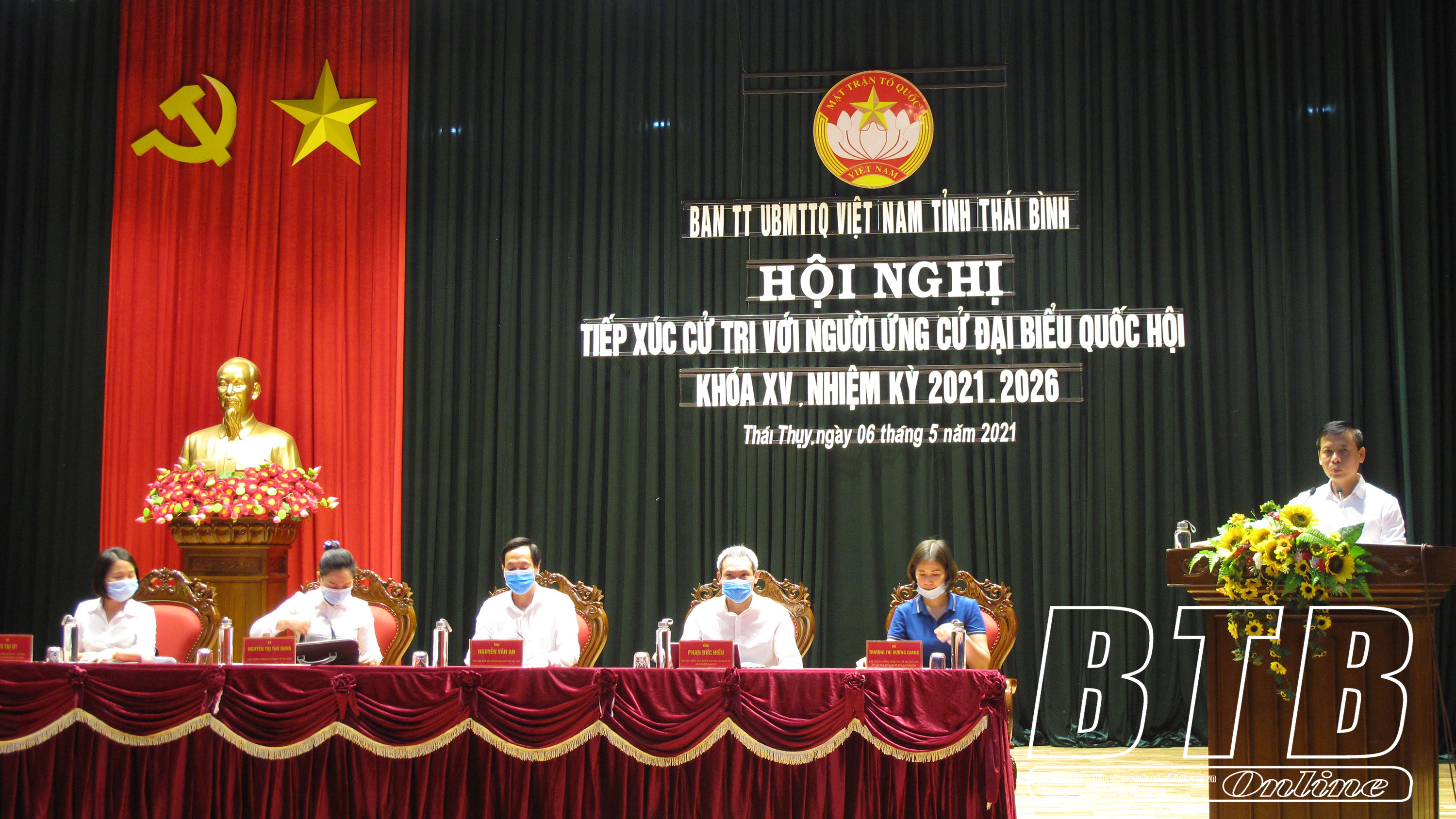 * Tại Trung tâm hội nghị huyện Thái Thụy, các cử tri đã nghe tiểu sử tóm tắt và chương trình hành động của các ứng cử viên đại biểu Quốc hội khóa XV nhiệm kỳ 2021 - 2026 thuộc đơn vị bầu cử số 2 gồm các ông, bà: Nguyễn Văn An, Phó Tổng giám đốc Truyền hình Quốc hội, Văn phòng Quốc hội; Nguyễn Thị Thu Dung, Hiệu trưởng Trường Cao đẳng Y tế Thái Bình; Trương Thị Hương Giang, Phó Trưởng phòng Nghiệp vụ thể dục thể thao, Sở Văn hóa, Thể thao và Du lịch; Phan Đức Hiếu, Phó Viện trưởng Viện Nghiên cứu quản lý kinh tế trung ương, Bộ Kế hoạch và Đầu tư; Vũ Thị Út, Phó Trưởng phòng Kế hoạch - Tài chính, Sở Khoa học và Công nghệ.
