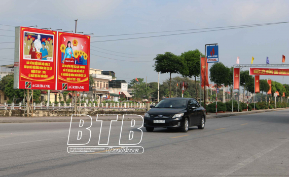 Trang trí khánh tiết chào mừng bầu cử tại thị trấn Quỳnh Côi (Quỳnh Phụ).