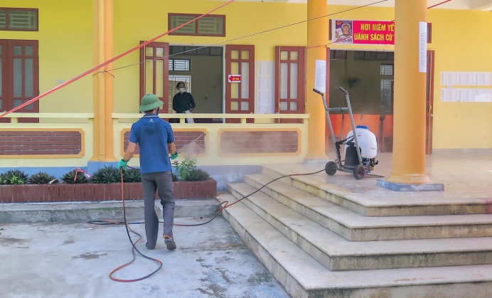Phun khử khuẩn phòng, chống dịch Covid-19 phục vụ bầu cử tại xã An Ấp (Quỳnh Phụ).