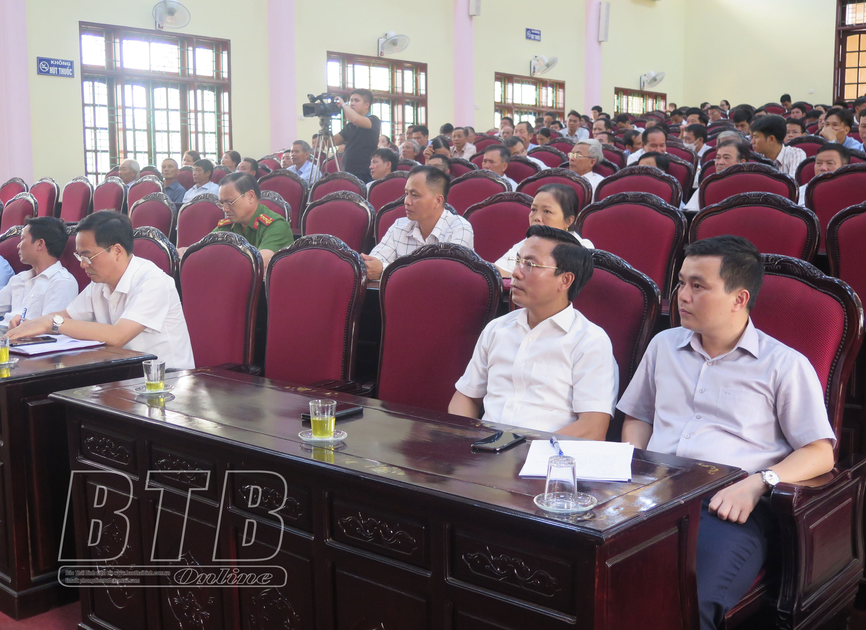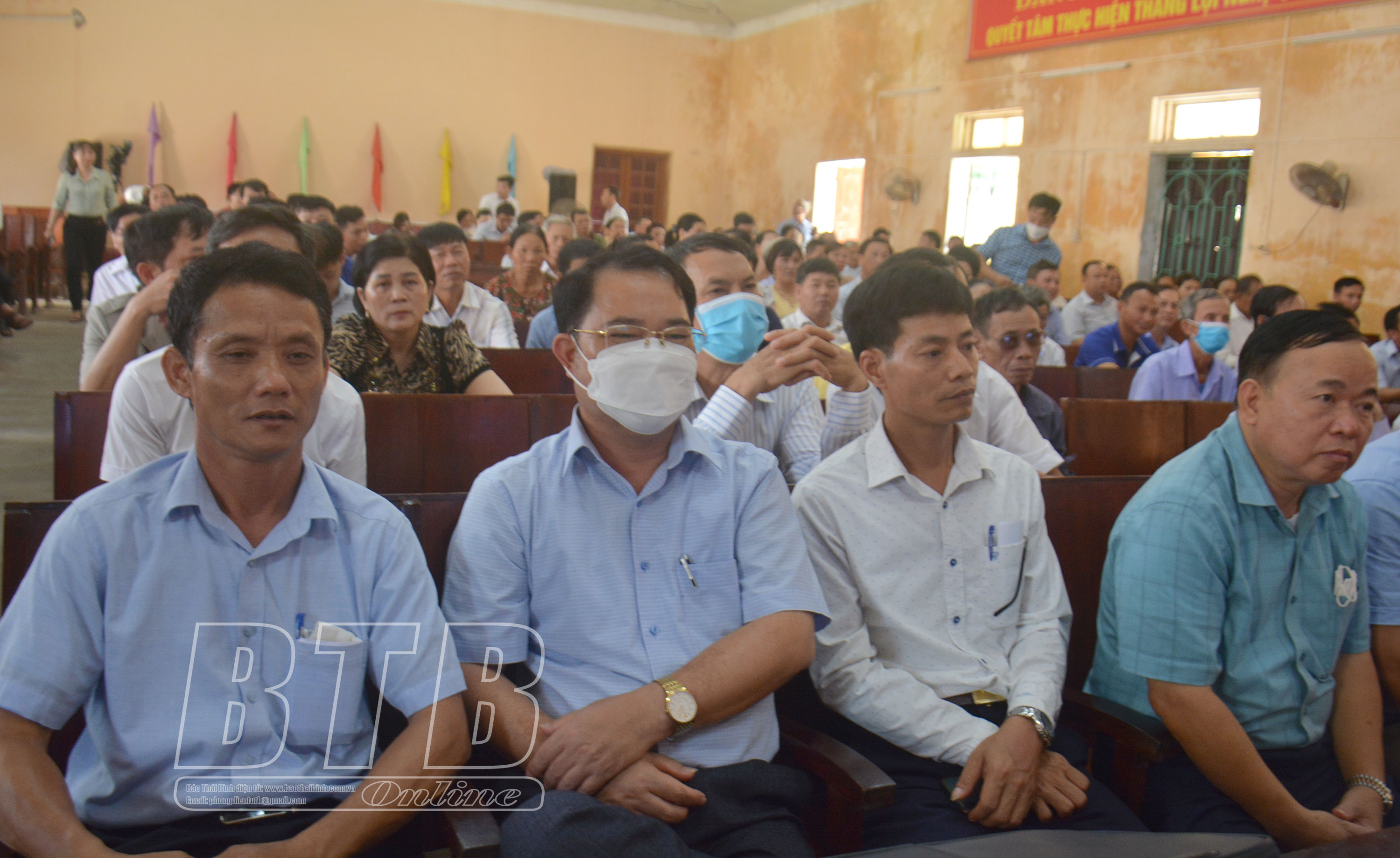 Các đồng chí lãnh đạo huyện Kiến Xương và cử tri dự hội nghị tiếp xúc cử tri. Ảnh: Thu Thủy