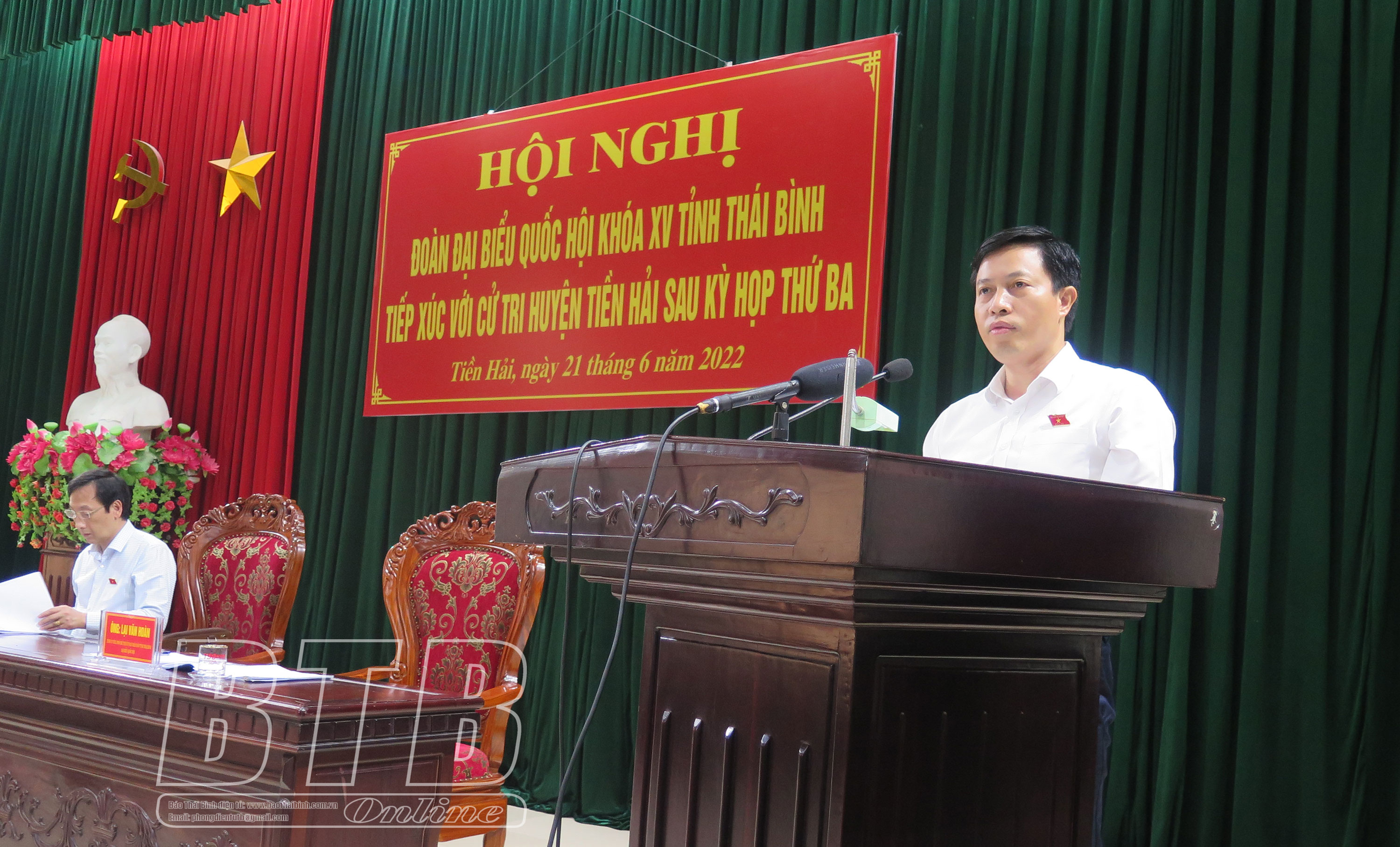 Đồng chí Lại Văn Hoàn, Tỉnh ủy viên, Phó Chủ tịch UBND tỉnh phát biểu tại hội nghị tiếp xúc cử tri huyện Tiền Hải. Ảnh: Thu Thủy