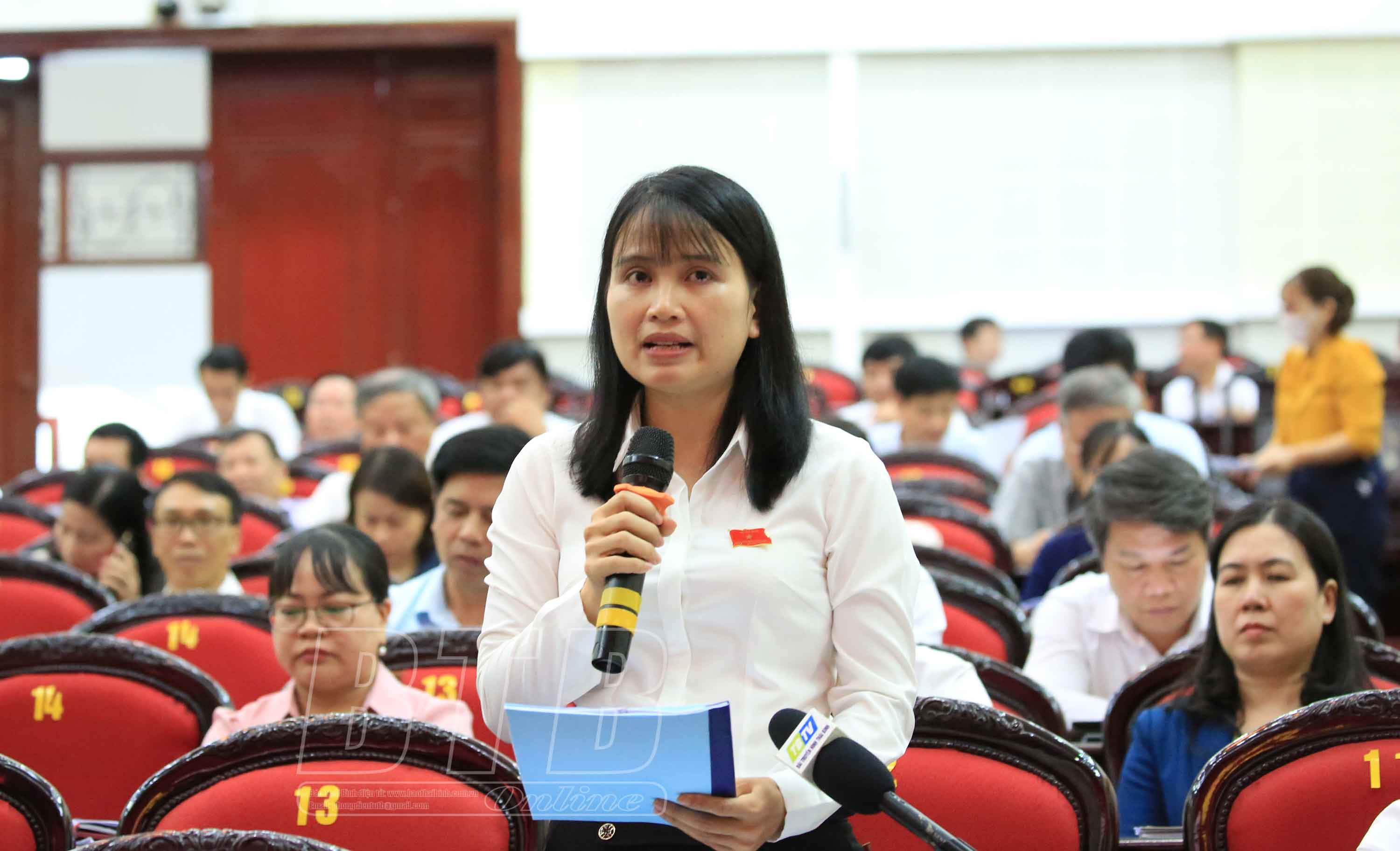 Đại biểu Đinh Thị Hồng Thái, tổ Quỳnh Phụ chất vấn tại hội trường.