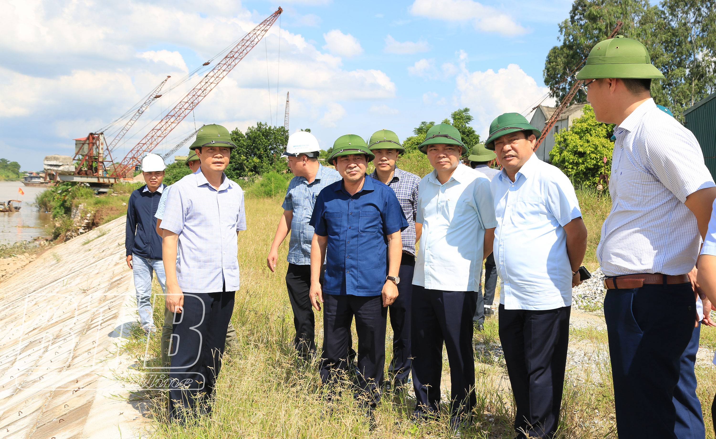 Đồng chí Nguyễn Tiến Thành, Phó Bí thư thường trực Tỉnh ủy, Chủ tịch HĐND tỉnh kiểm tra tiến độ thực hiện dự án nâng cấp công trình chống sạt lở, bảo vệ tuyến đê, địa phận xã Tiến Đức, huyện Hưng Hà.