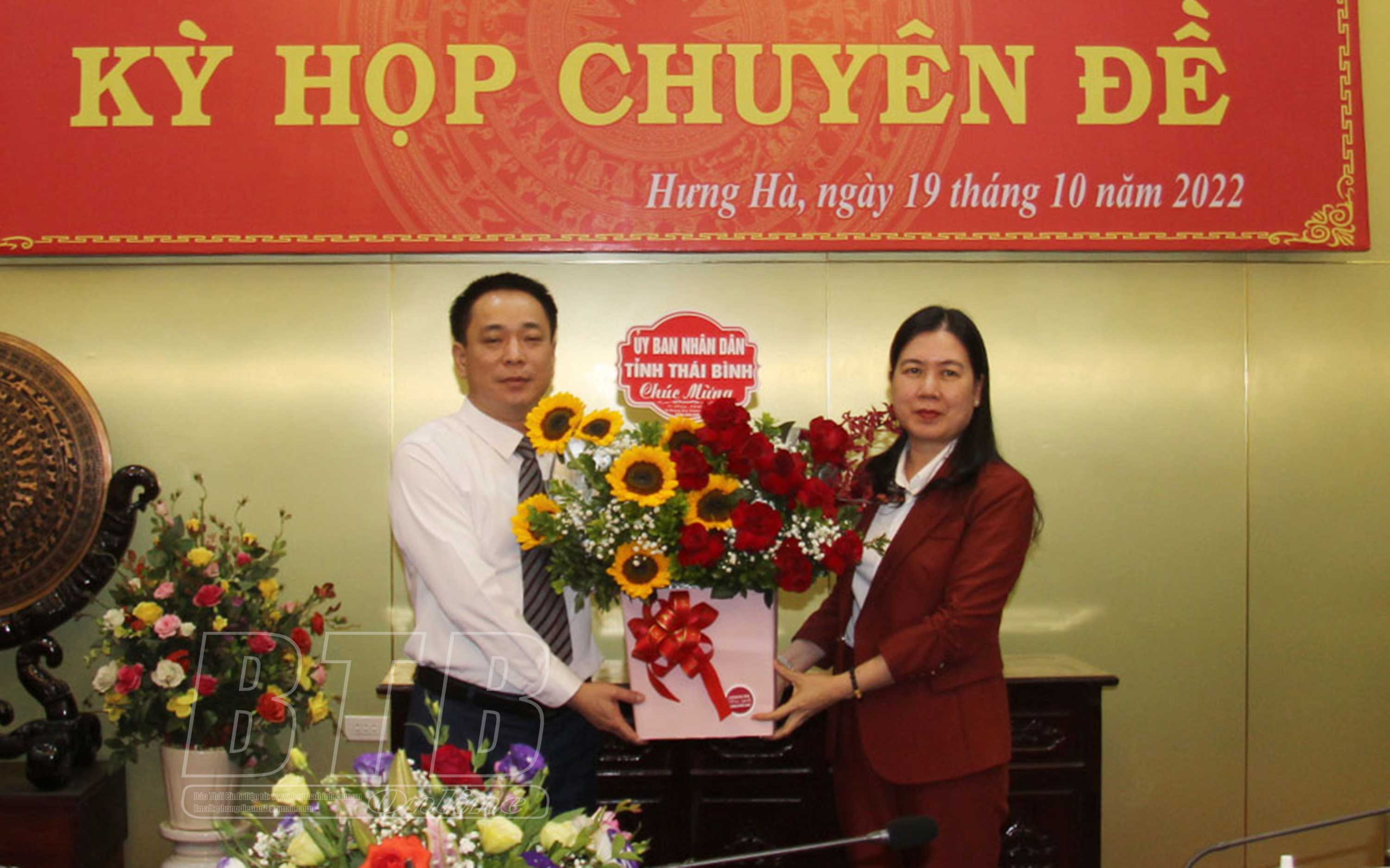 Đồng chí Trần Thị Bích Hằng, Tỉnh ủy viên, Phó Chủ tịch UBND tỉnh tặng hoa chúc mừng đồng chí Phạm Cao Quân, Chủ tịch UBND huyện Hưng Hà.