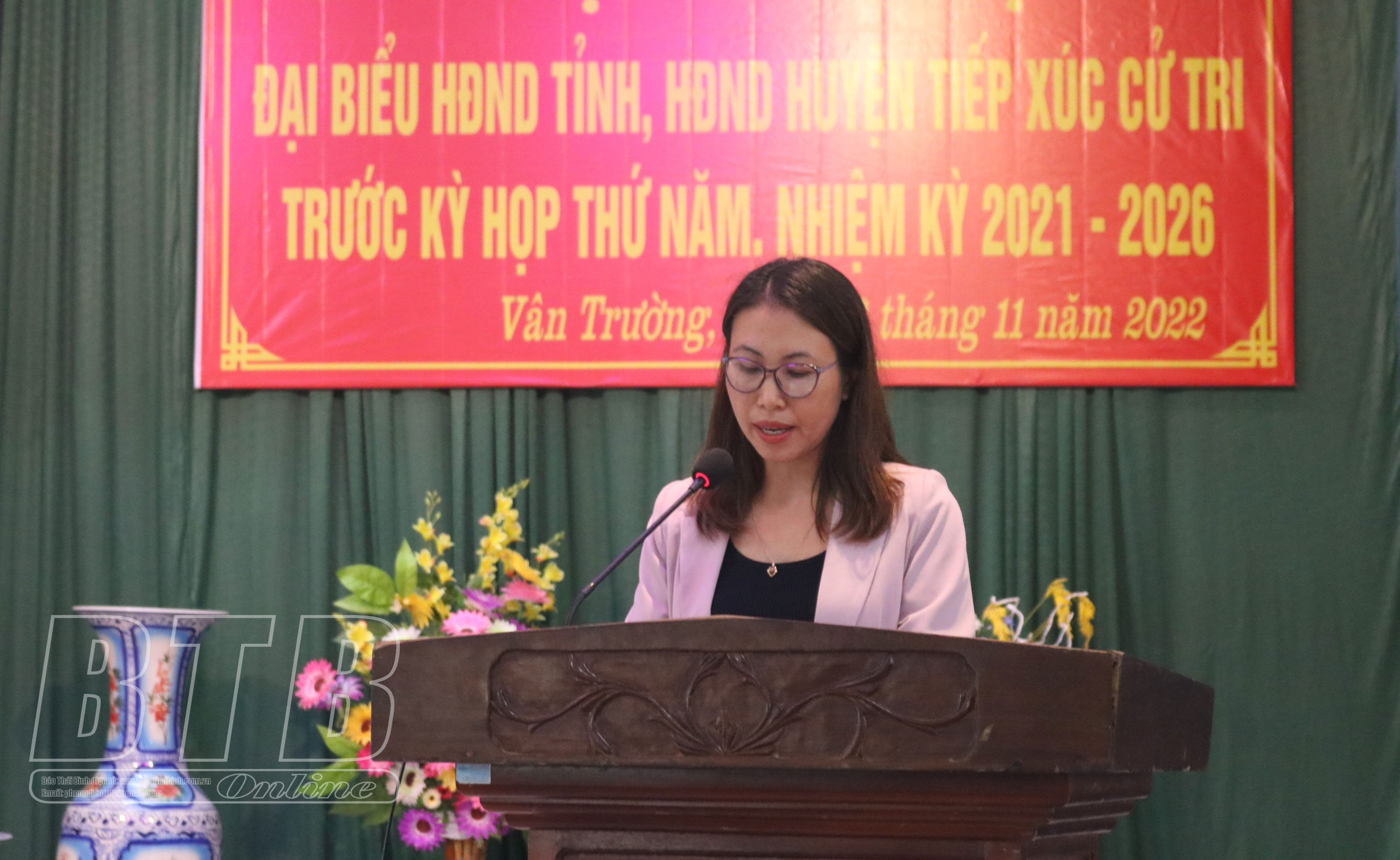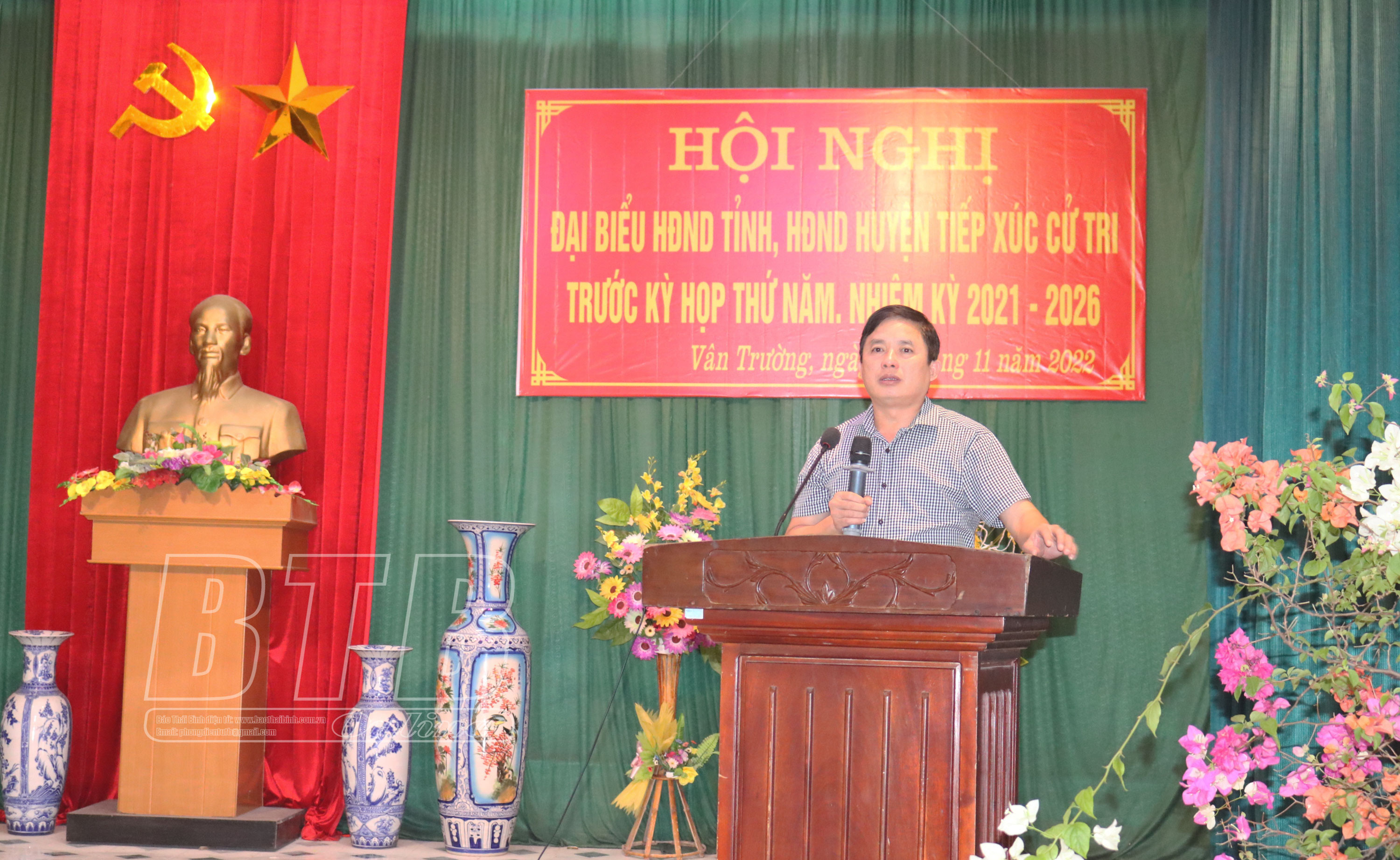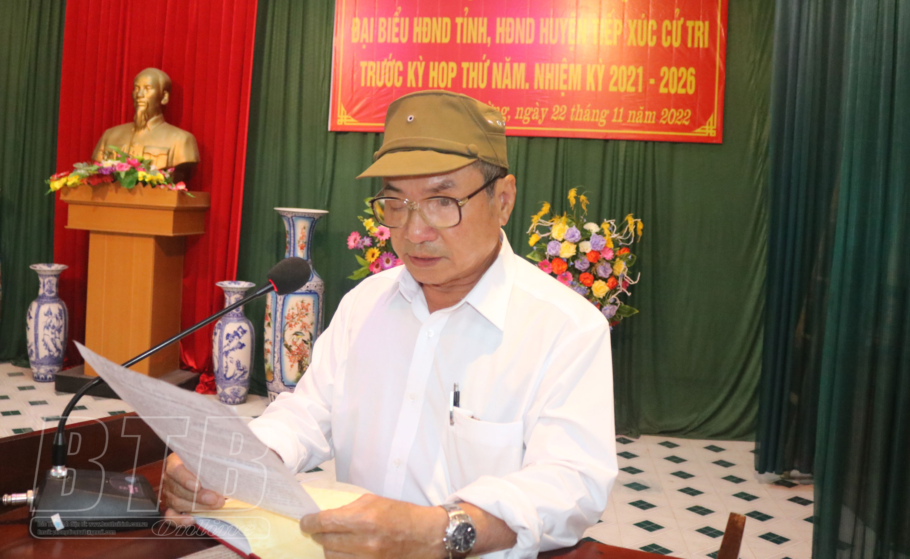 Tại hội nghị tiếp xúc, đại diện đại biểu HĐND tỉnh, HĐND huyện Tiền Hải thông báo tới cử tri dự kiến chương trình kỳ họp thứ năm, HĐND tỉnh khóa XVII và HĐND huyện Tiền Hải; dự thảo báo cáo tình hình kinh tế - xã hội năm 2022 của tỉnh, mục tiêu và những nhiệm vụ, giải pháp chủ yếu năm 2023.