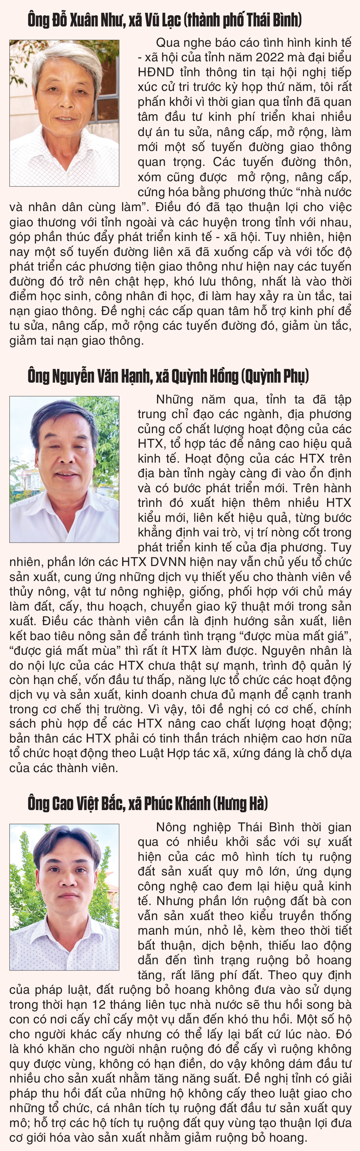 Kỳ họp thứ năm, HĐND tỉnh khóa XVII, nhiệm kỳ 2021 - 2026 diễn ra từ ngày 7 - 9/12/2022 sẽ xem xét, thảo luận và thông qua nhiều nội dung quan trọng. Trước kỳ họp, Báo Thái Bình ghi nhận một số ý kiến tâm huyết cử tri gửi tới kỳ họp.