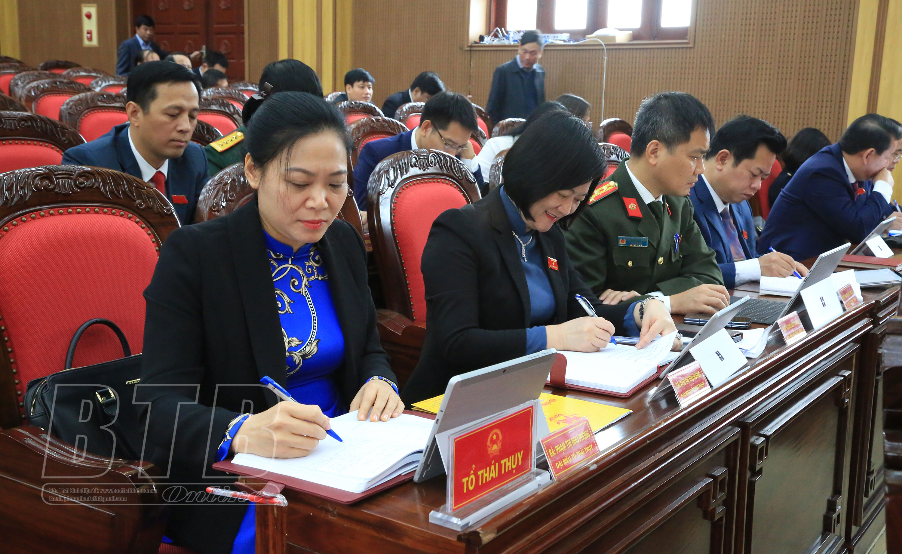 Tiếp đó, HĐND tỉnh nghe báo cáo tình hình thực hiện dự toán ngân sách nhà nước năm 2022 và phân bổ dự toán ngân sách năm 2023; các tờ trình về việc ban hành quy định về mức hỗ trợ thường xuyên hằng tháng đối với các chức danh đội trưởng, đội phó dân phòng; ban hành Nghị quyết của HĐND tỉnh quy định tỷ lệ phần trăm (%) phân chia các khoản thu giữa các cấp ngân sách tỉnh Thái Bình năm 2023 và các năm tiếp theo của giai đoạn 2023-2025; ban hành danh mục dịch vụ sự nghiệp công sử dụng ngân sách nhà nước lĩnh vực tài chính của Sở Tài chính Thái Bình; ban hành quy định khu vực thuộc nội thành của thành phố, thị trấn, khu dân cư không được phép chăn nuôi; vùng nuôi chim yến và chính sách hỗ trợ khi di dời cơ sở chăn nuôi ra khỏi khu vực không được phép chăn nuôi trên địa bàn tỉnh Thái Bình; ban hành quy định giá cụ thể sản phẩm dịch vụ công ích thủy lợi năm 2022; quy định một số mức hỗ trợ theo Nghị định 105/2020/NĐ-CP ngày 8/9/2020 của Chính phủ về chính sách phát triển giáo dục mầm non trên địa bàn tỉnh Thái Bình; ban hành quy định mức học phí đối với các cơ sở giáo dục mầm non, giáo dục phổ thông công lập trên địa bàn tỉnh Thái Bình năm 2022 – 2023; phê duyệt tổng số lượng người làm việc trong các đơn vị sự nghiệp công lập và định suất hợp đồng lao động để hỗ trợ kinh phí hoạt động năm 2023; phê duyệt biên chế công chức trong các cơ quan tổ chức hành chính nhà nước của tỉnh năm 2023; ban hành Nghị quyết không giao lao động hợp đồng theo Nghị định số 68/2000/NĐ-CP ngày 17/11/2000 của Chính phủ trong các cơ quan, tổ chức hành chính nhà nước, đơn vị sự nghiệp công lập của tỉnh từ năm 2023; phê duyệt danh mục dự án cần thu hồi đất để phát triển kinh tế - xã hội vì lợi ích quốc gia, công cộng trên địa bàn tỉnh Thái Bình năm 2023; chuyển mục đích sử dụng đất trồng lúa để thực hiện các dự án trên địa bàn tỉnh Thái Bình.