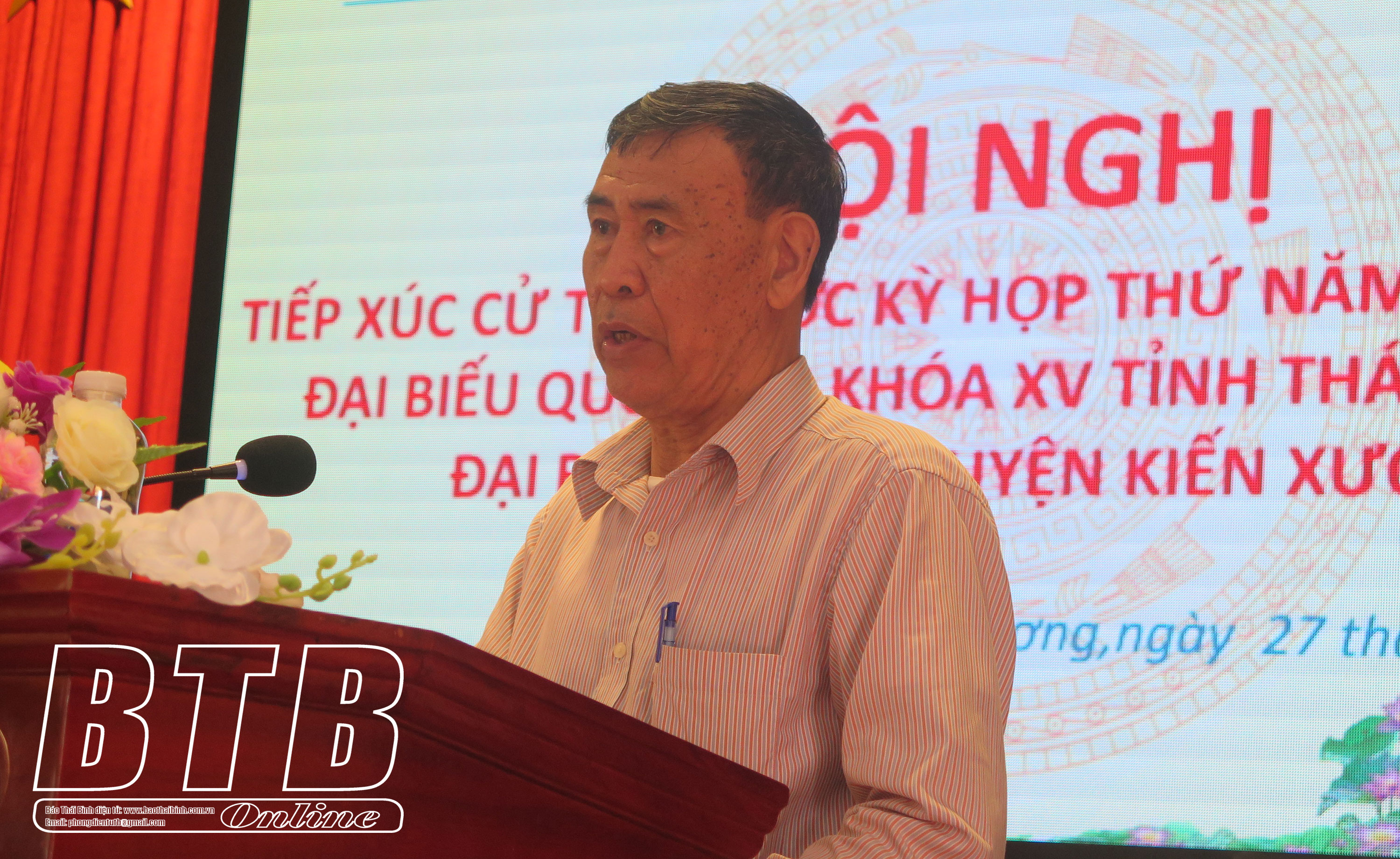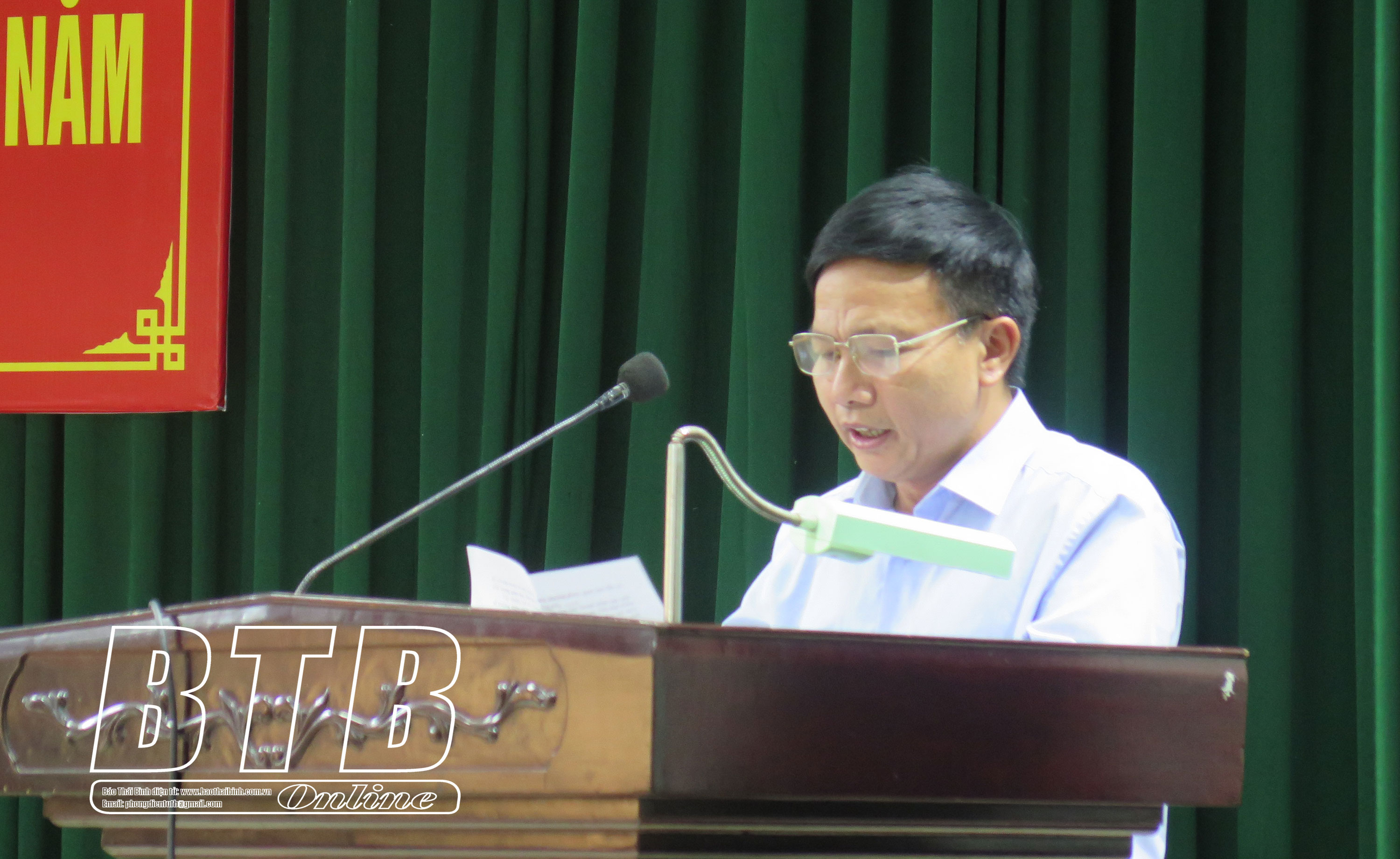 Đại biểu Nguyễn Văn Huy, Tỉnh ủy viên, Phó Trưởng đoàn đại biểu Quốc hội chuyên trách tỉnh phát biểu tại hội nghị tiếp xúc cử tri huyện Tiền Hải.