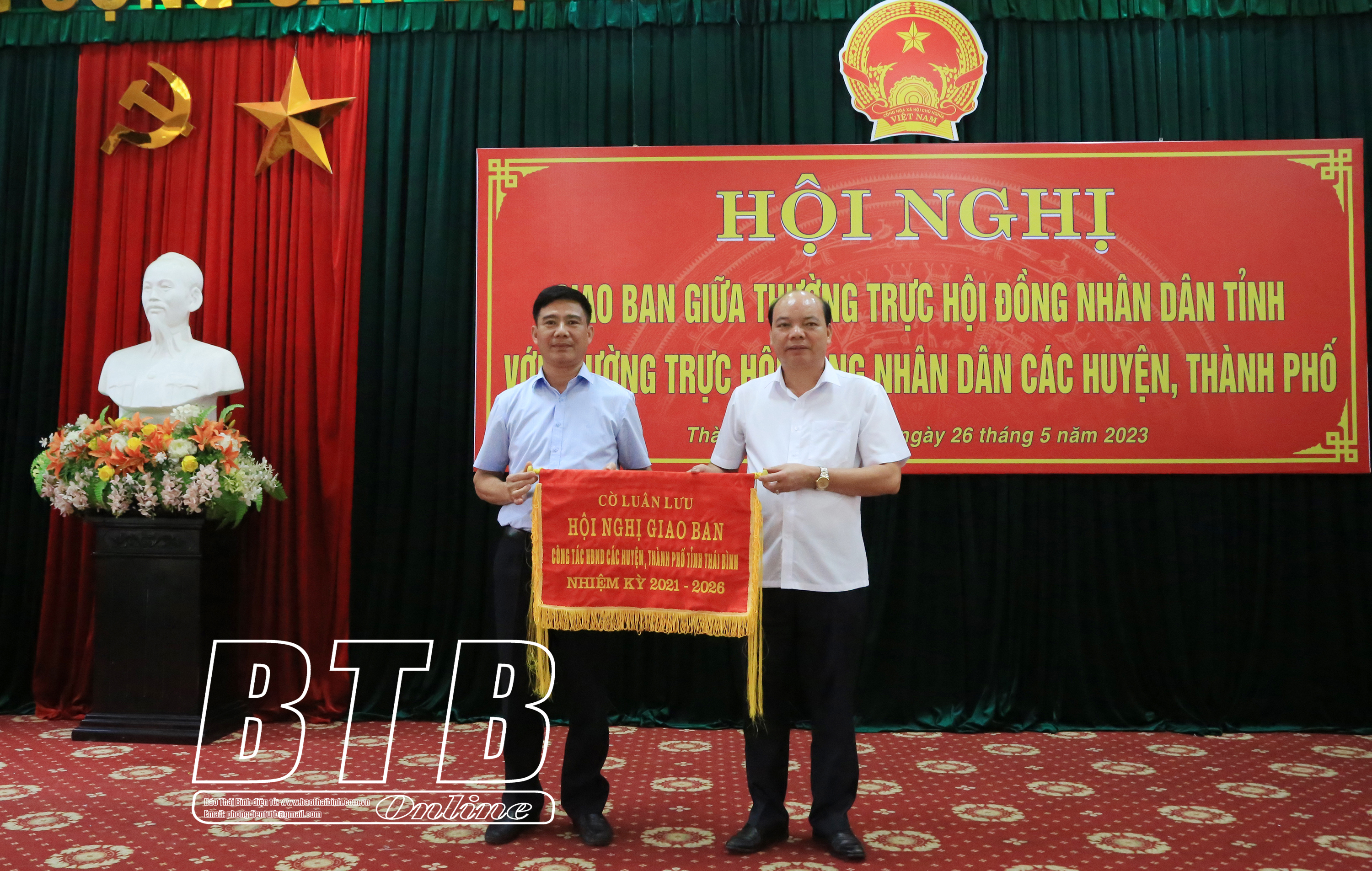 Tại hội nghị, lãnh đạo HĐND tỉnh đã tặng hoa, trao cờ đăng cai tổ chức hội nghị giao ban lần tới cho HĐND huyện Hưng Hà.