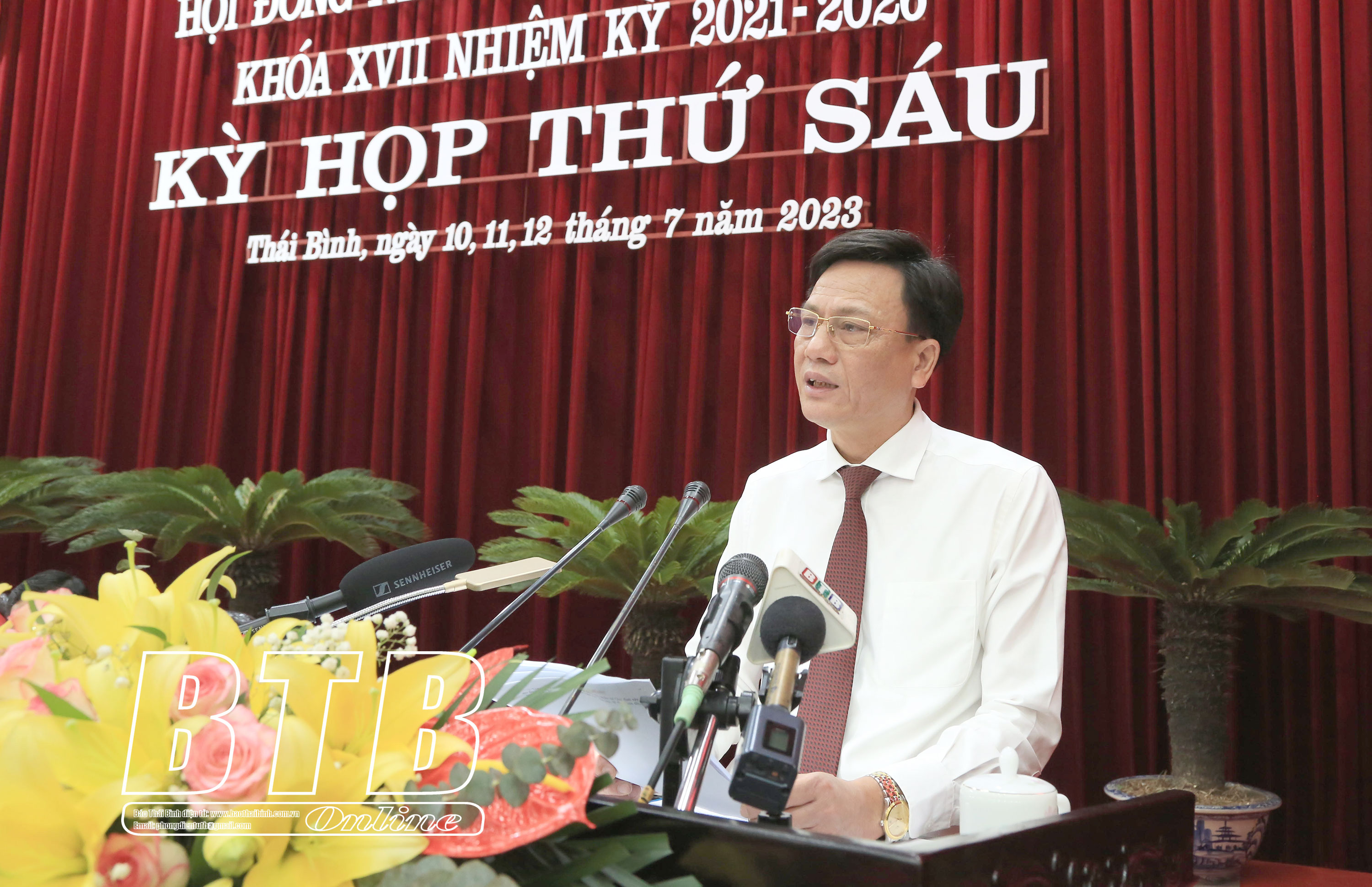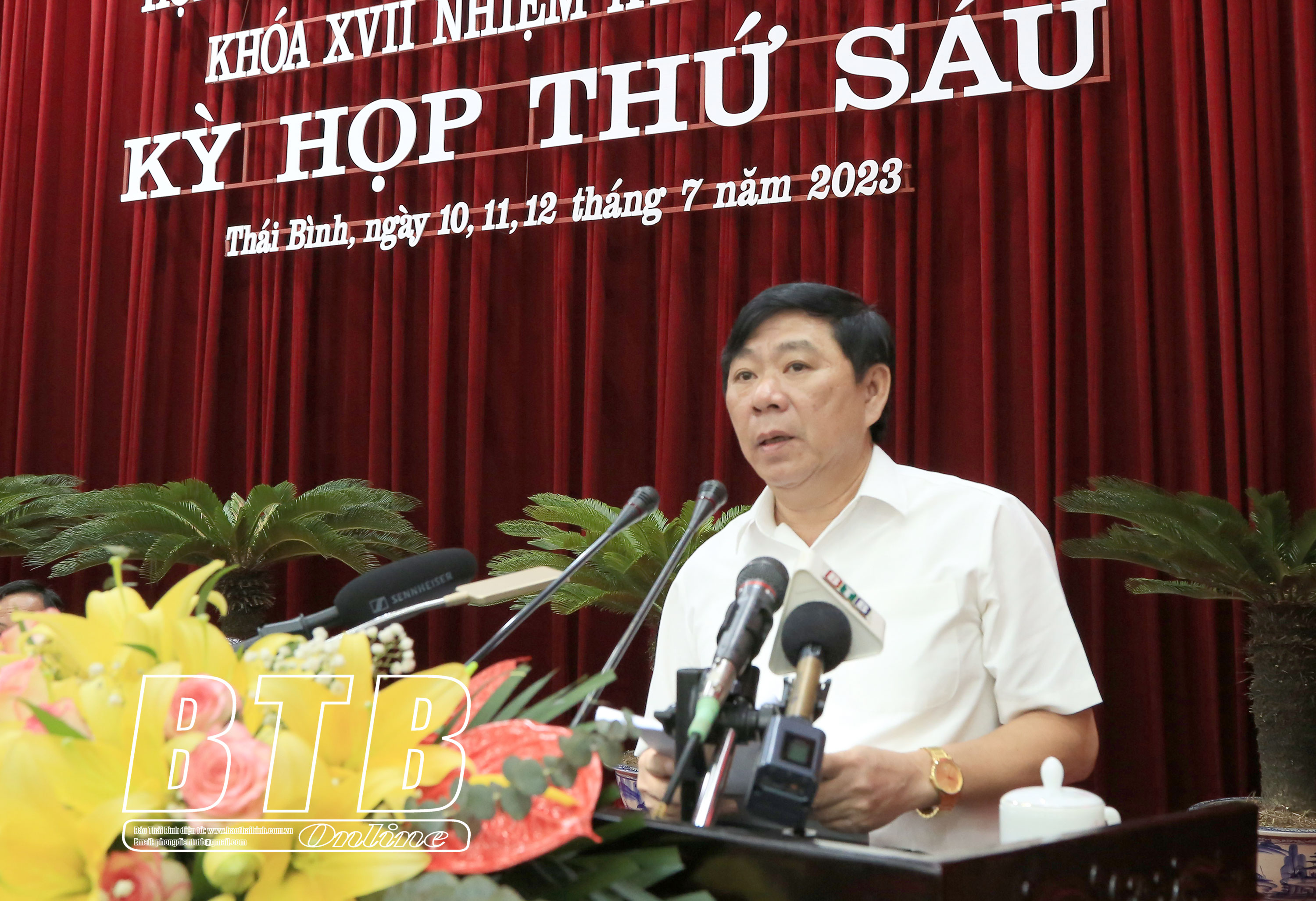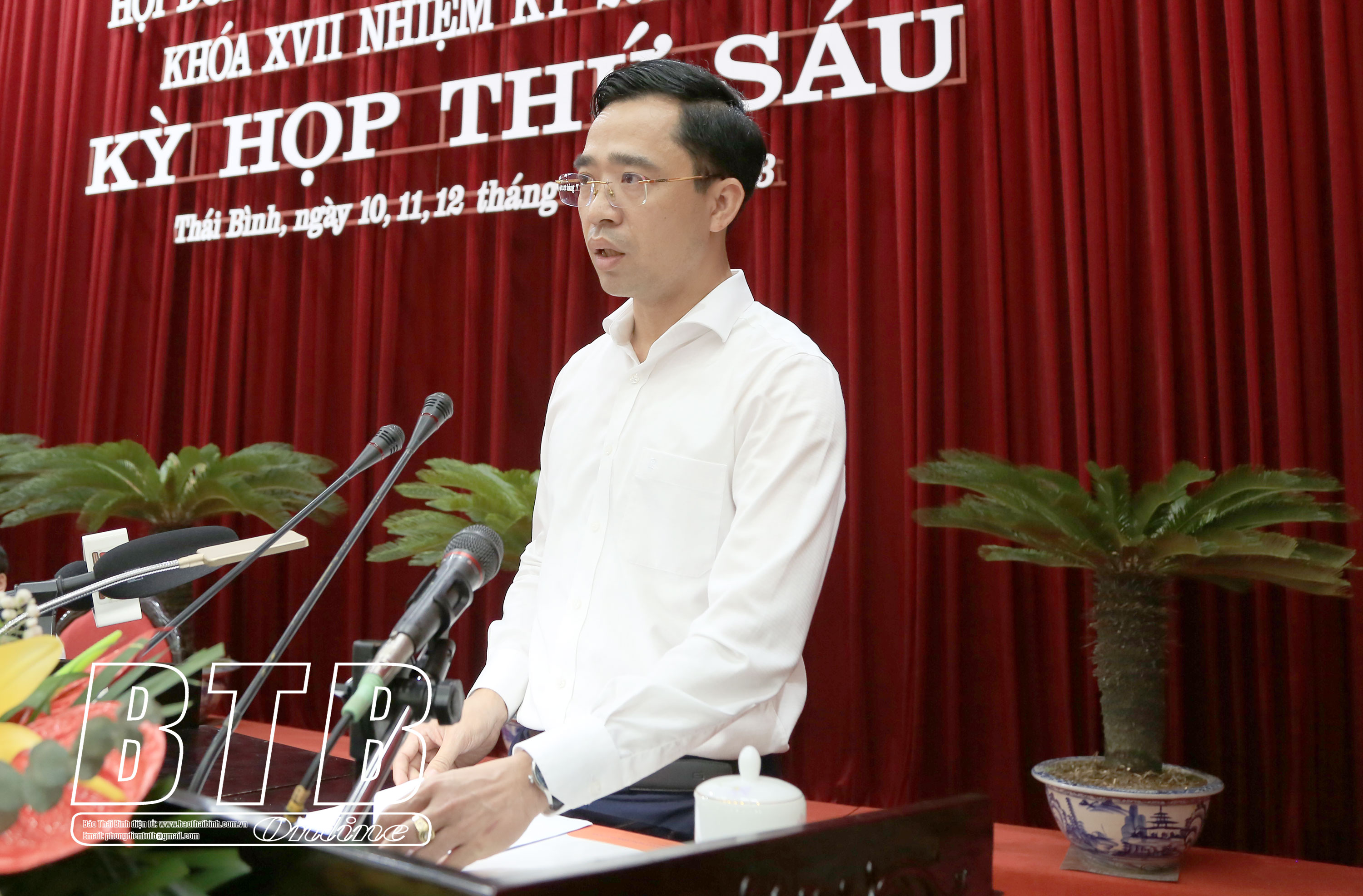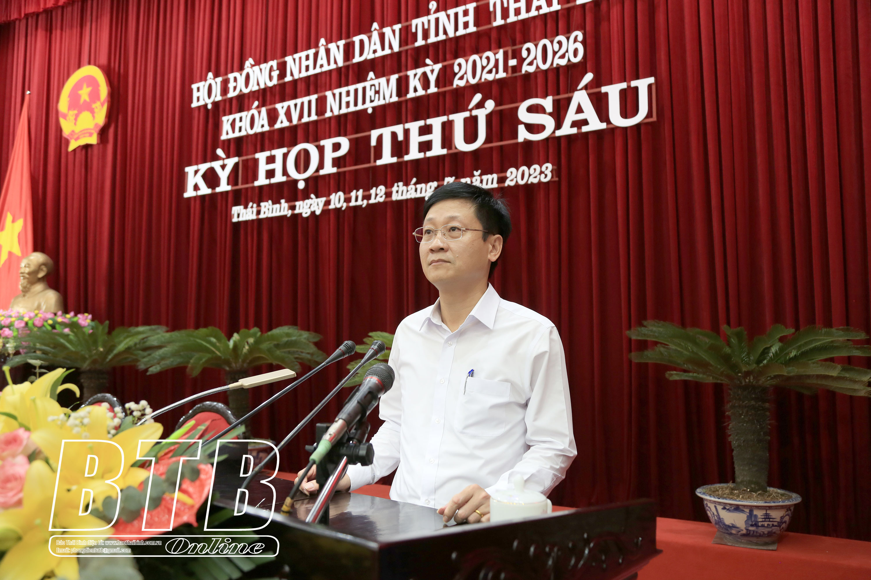 Đồng chí cũng báo cáo các tờ trình của UBND tỉnh: Sửa đổi, bổ sung điều 4 quy định nguyên tắc tiêu chí, định mức phân bổ vốn ngân sách trung ương, mức đối ứng ngân sách địa phương thực hiện chương trình mục tiêu quốc gia xây dựng nông thôn mới giai đoạn 2021-2025 trên địa bàn tỉnh Thái Bình ban hành kèm theo Nghị quyết số 10/2022/NQ-HĐND ngày 24 tháng 8 năm 2022 của HĐND tỉnh; Phân bổ bổ sung kế hoạch vốn Chính phủ vay về cho vay lại năm 2023; phê duyệt phương án phân bổ chi tiết kế hoạch vốn từ nguồn sửa chữa lớn; Ban hành quy định cơ chế, chính sách hỗ trợ tích tụ, tập trung đất đai để phát triển kinh tế nông nghiệp tỉnh Thái Bình giai đoạn đến năm 2028; phân bổ kế hoạch vốn đầu tư phát triển nguồn ngân sách trung ương bổ sung hỗ trợ thực hiện Chương trình mục tiêu quốc gia xây dựng nông thôn mới giai đoạn 2021 - 2025 trên địa bàn tỉnh Thái Bình.