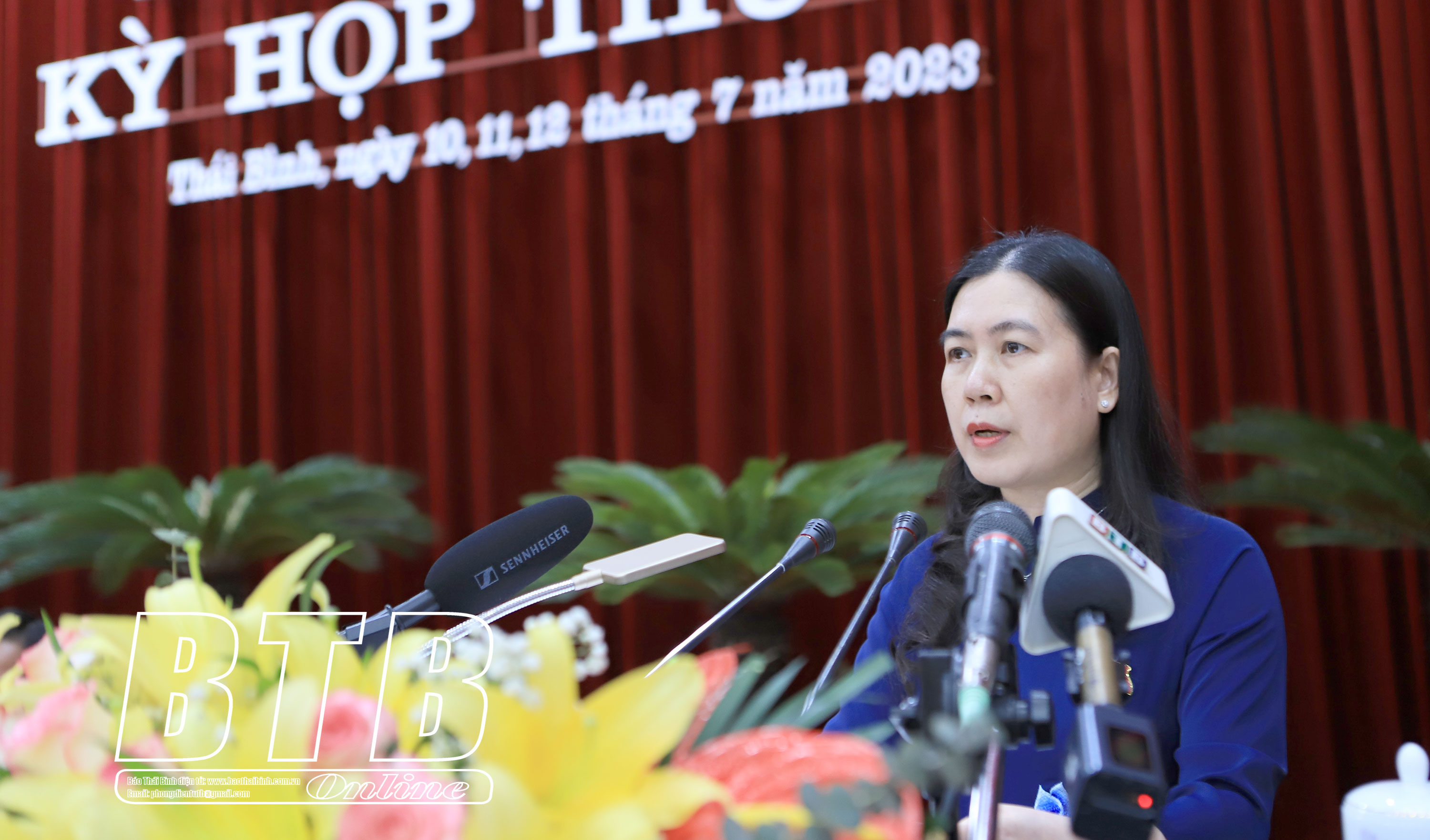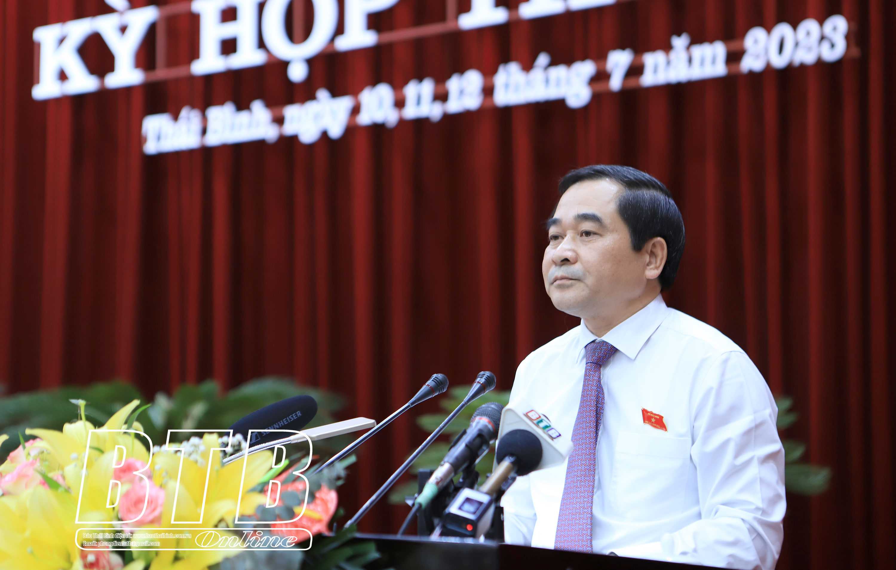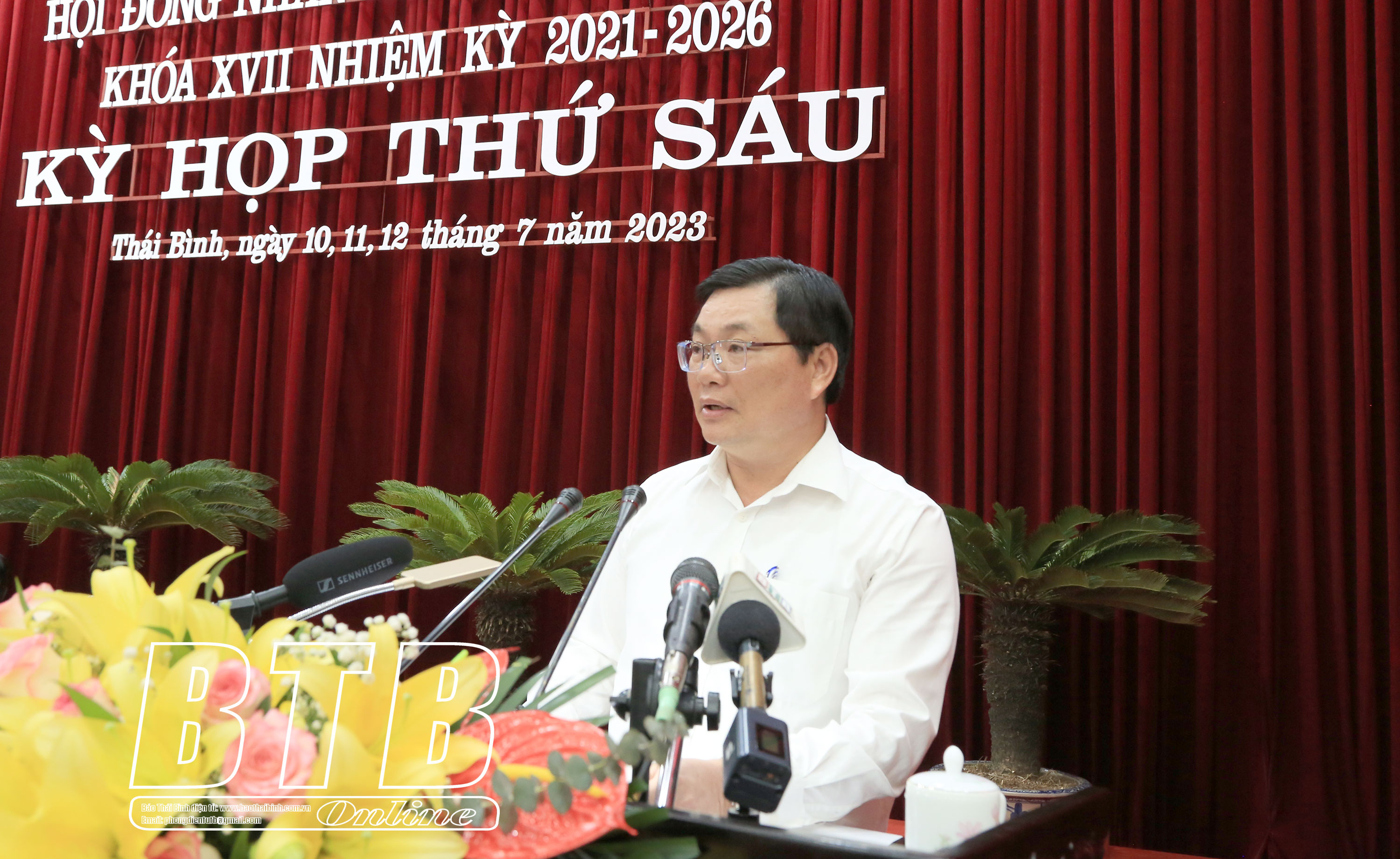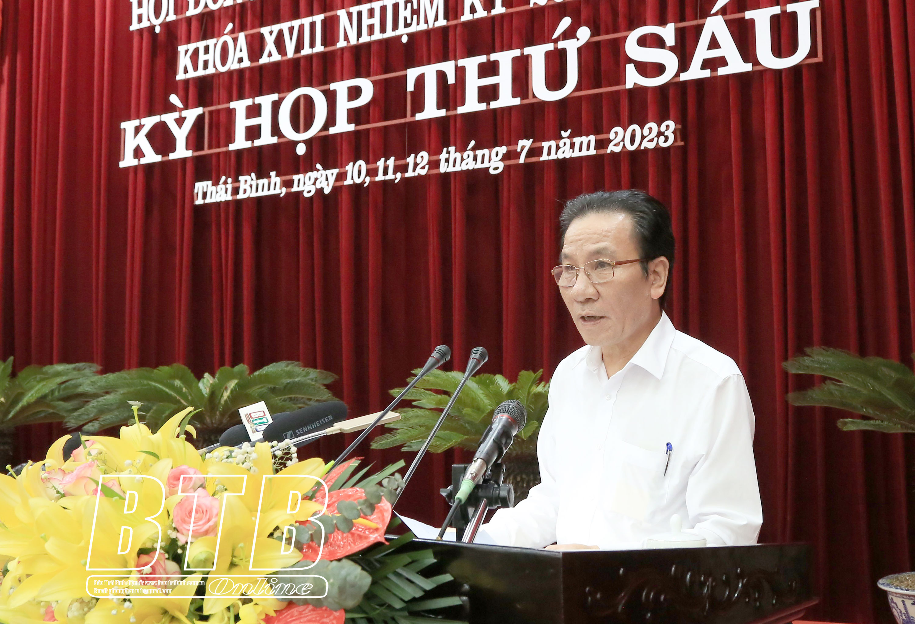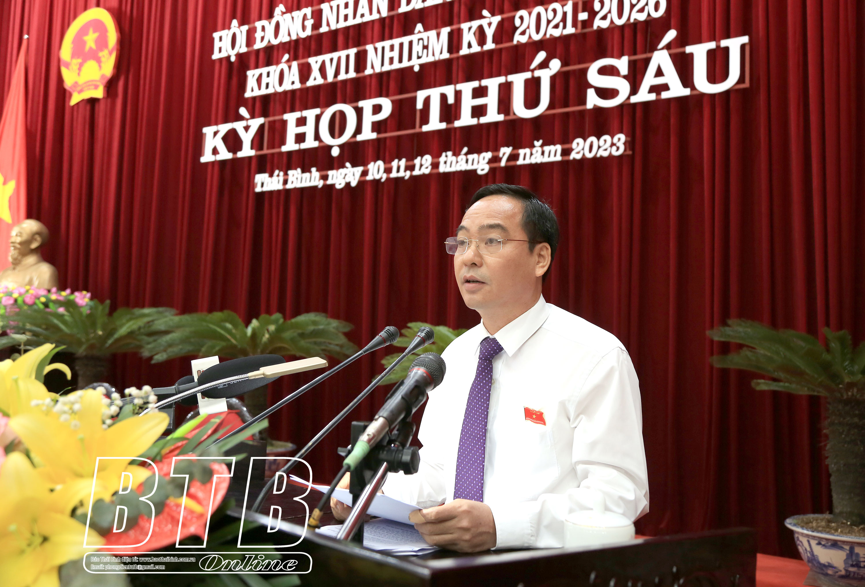 Đồng chí cũng báo cáo các tờ trình của UBND tỉnh: Sửa đổi, bổ sung điều 4 quy định nguyên tắc tiêu chí, định mức phân bổ vốn ngân sách trung ương, mức đối ứng ngân sách địa phương thực hiện chương trình mục tiêu quốc gia xây dựng nông thôn mới giai đoạn 2021-2025 trên địa bàn tỉnh Thái Bình ban hành kèm theo Nghị quyết số 10/2022/NQ-HĐND ngày 24 tháng 8 năm 2022 của HĐND tỉnh; Phân bổ bổ sung kế hoạch vốn Chính phủ vay về cho vay lại năm 2023; phê duyệt phương án phân bổ chi tiết kế hoạch vốn từ nguồn sửa chữa lớn; Ban hành quy định cơ chế, chính sách hỗ trợ tích tụ, tập trung đất đai để phát triển kinh tế nông nghiệp tỉnh Thái Bình giai đoạn đến năm 2028; phân bổ kế hoạch vốn đầu tư phát triển nguồn ngân sách trung ương bổ sung hỗ trợ thực hiện Chương trình mục tiêu quốc gia xây dựng nông thôn mới giai đoạn 2021 - 2025 trên địa bàn tỉnh Thái Bình.