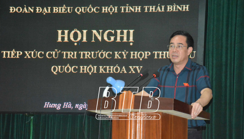 Đại biểu Nguyễn Văn Huy, Tỉnh ủy viên, Phó Trưởng đoàn đại biểu Quốc hội chuyên trách tỉnh phát biểu tại hội nghị tiếp xúc cử tri huyện Hưng Hà.