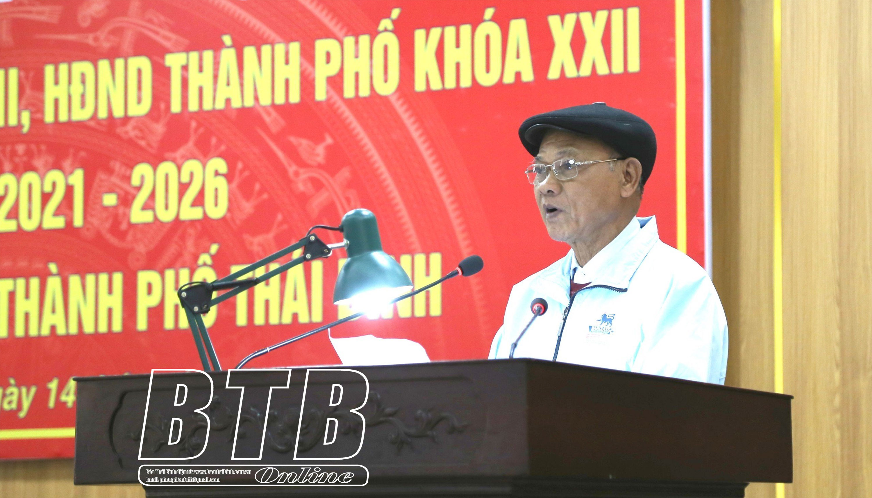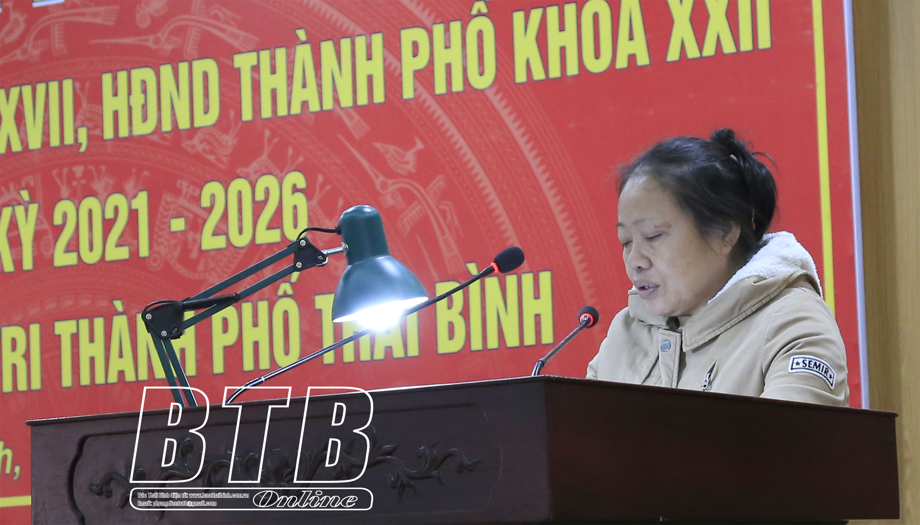 Cử tri thành phố phát biểu cơ bản nhất trí với dự kiến nội dung, chương trình kỳ họp; đồng thời kiến nghị một số vấn đề đáng quan tâm. Cử tri phường Trần Lãm nêu thực trạng tuyến đường Trần Lãm xuống cấp ảnh hưởng đến giao thông đi lại, kiến nghị bố trí nguồn lực để tu sửa, nâng cấp mặt đường. Cử tri phường Tiền Phong kiến nghị một số nội dung liên quan đến xử lý rác thải, vệ sinh môi trường, phát triển đô thị 2 bên sông Trà Lý, việc bảo đảm an sinh xã hội sau thu hồi đất nông nghiệp phục vụ công trình công cộng, di chuyển một số trụ sở sang địa điểm mới bảo đảm an toàn giao thông, làm tốt hơn công tác tiếp công dân, giải quyết khiếu nại, tố cáo…