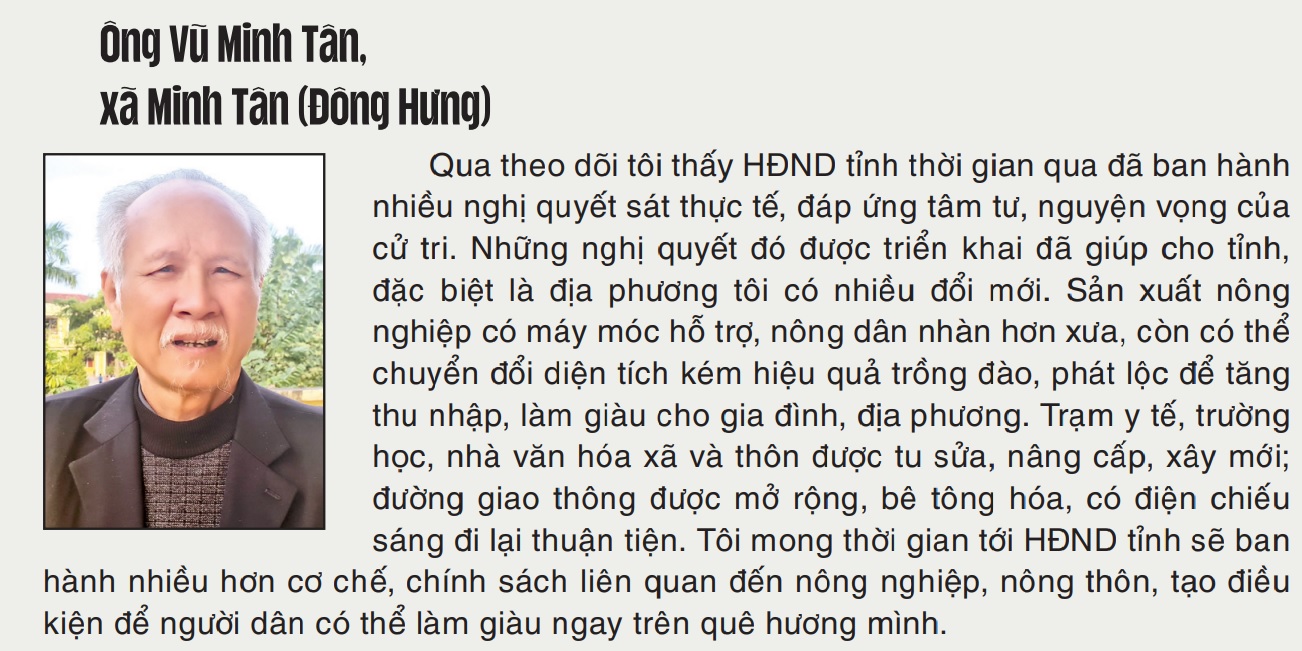 Theo đồng chí Đặng Thanh Giang, Ủy viên Ban Thường vụ Tỉnh ủy, Phó Chủ tịch thường trực HĐND tỉnh: Từ đầu nhiệm kỳ đến nay, HĐND tỉnh đã ban hành 183 nghị quyết phục vụ phát triển kinh tế - xã hội của tỉnh tại 13 kỳ họp. Các nghị quyết đều mang tính thời sự, cấp bách, thực sự đi vào cuộc sống, tạo hành lang pháp lý quan trọng cho UBND tỉnh triển khai thực hiện và được nhân dân đồng tình, ủng hộ. Chất lượng các nghị quyết ban hành ngày càng nâng cao, kịp thời thể chế hóa các chủ trương của Đảng, chính sách, pháp luật của Nhà nước, phù hợp với tình hình thực tế của địa phương. Trong đó có nhiều nghị quyết về cơ chế, chính sách làm cơ sở pháp lý, điều kiện cho doanh nghiệp, các địa phương khai thác tối đa tiềm năng, thế mạnh, tạo động lực thu hút các nguồn lực đầu tư. Thái Bình là tỉnh đầu tiên trong cả nước ban hành cơ chế, chính sách riêng hỗ trợ tích tụ, tập trung đất đai, mua máy cấy, hệ thống thiết bị sấy phục vụ phát triển kinh tế nông nghiệp; ban hành một loạt nghị quyết về cơ chế, chính sách liên quan đến xây dựng nông thôn mới thực hiện trong giai đoạn 2022 - 2025, chương trình “Thắp sáng đường quê”...