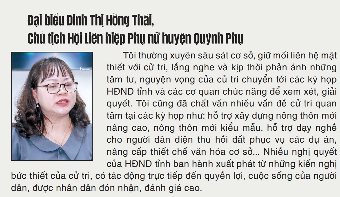 Thực hiện tốt vai trò của mình, thời gian qua, các đại biểu HĐND tỉnh đã tích cực truyền tải ý kiến của cử tri và nhân dân tới các kỳ họp HĐND tỉnh. Vấn đề quản lý đất đai, cấp giấy chứng nhận quyền sử dụng đất, xử lý rác thải, bảo vệ môi trường, thu hút đầu tư vào các khu, cụm công nghiệp, dạy thêm, học thêm trái quy định, đầu tư xây dựng các công trình cấp thiết, công tác quản lý hàng hóa... được các đại biểu phát biểu, chất vấn đã làm “nóng” nghị trường. Qua đó cho thấy HĐND tỉnh, các đại biểu HĐND tỉnh ngày càng quan tâm, nói được tiếng nói của dân để nghị quyết ban hành sát thực tế cuộc sống hơn.