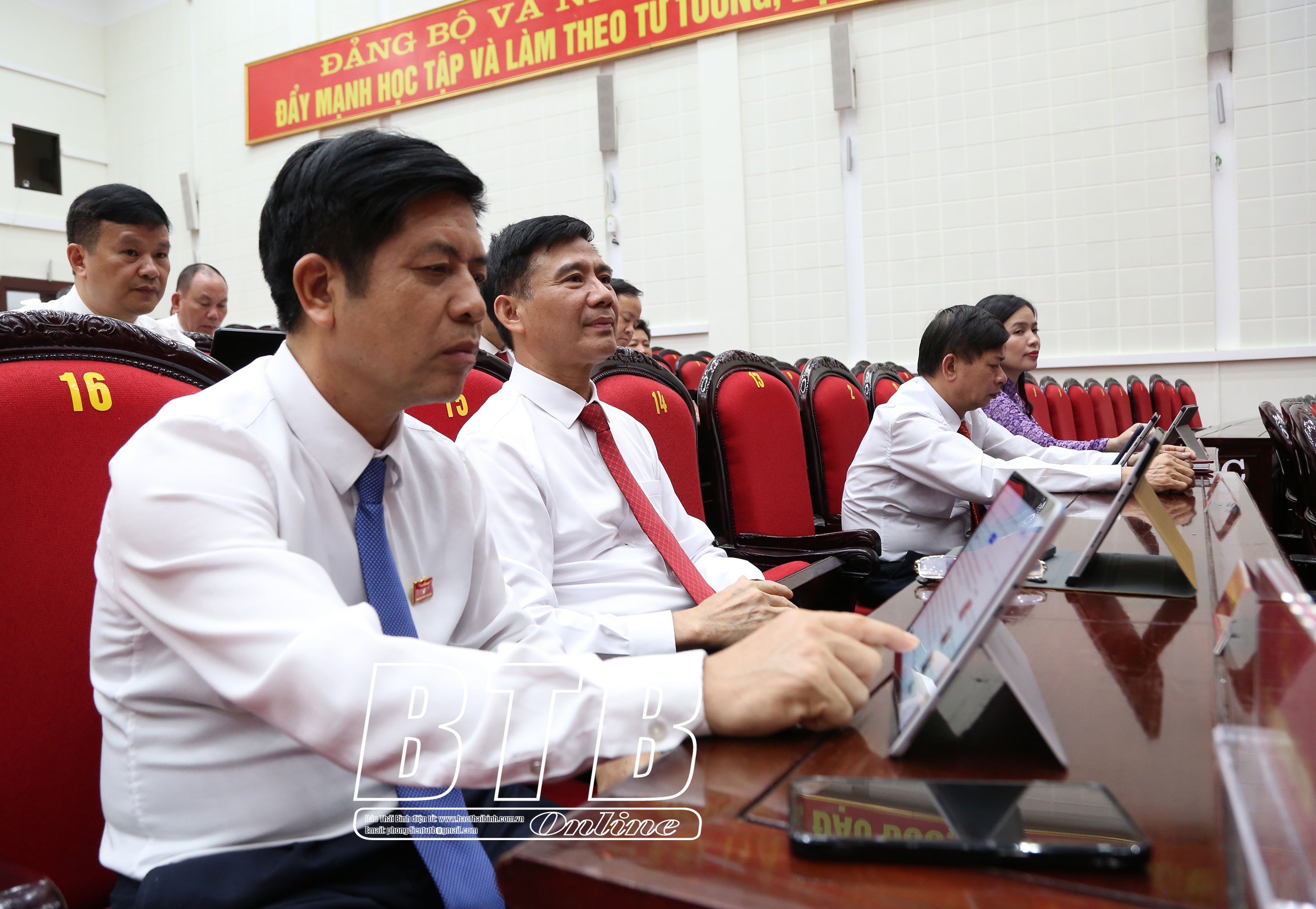 Các đại biểu nghiên cứu tài liệu trên máy tính bảng qua phần mềm kỳ họp không giấy tờ.