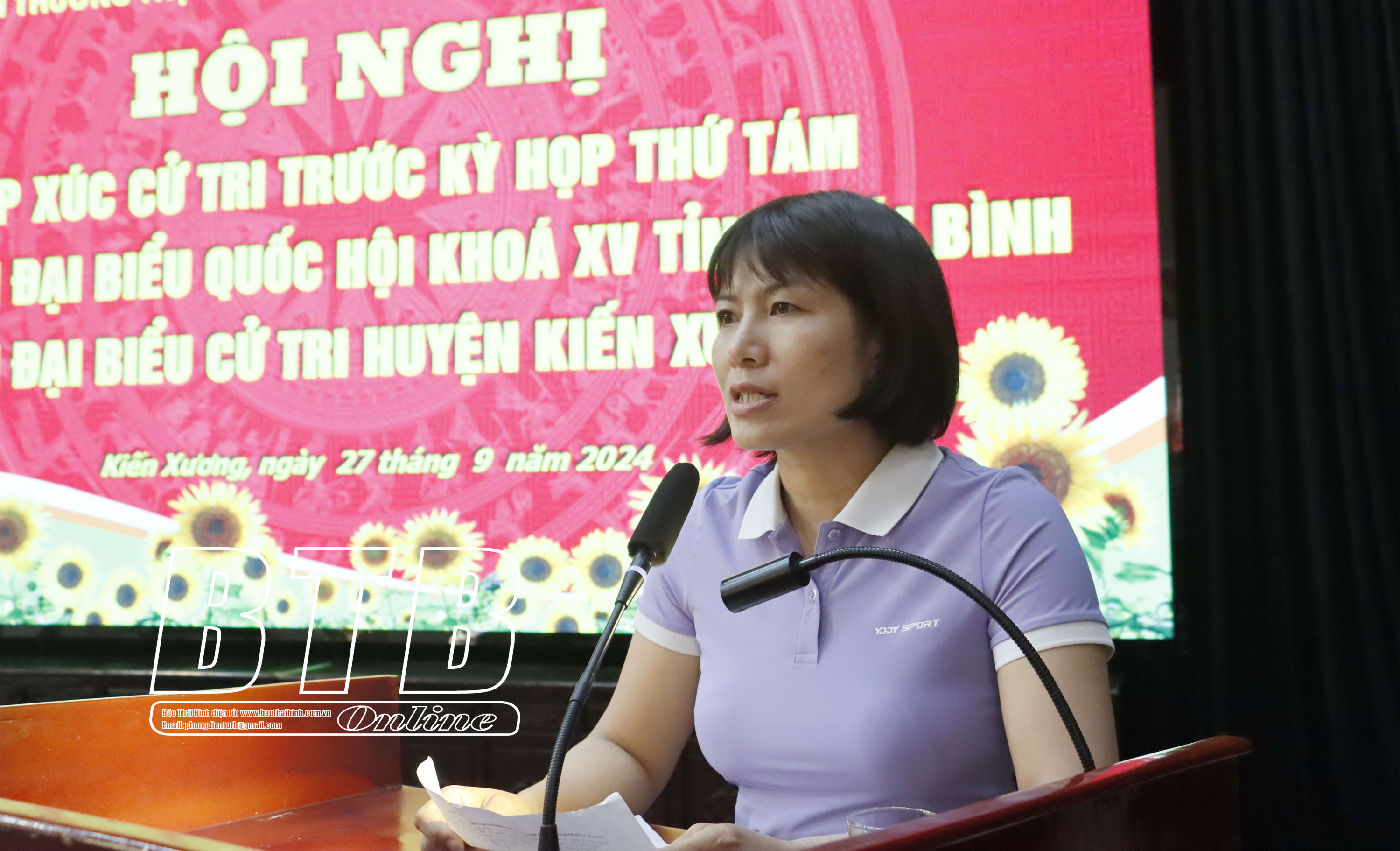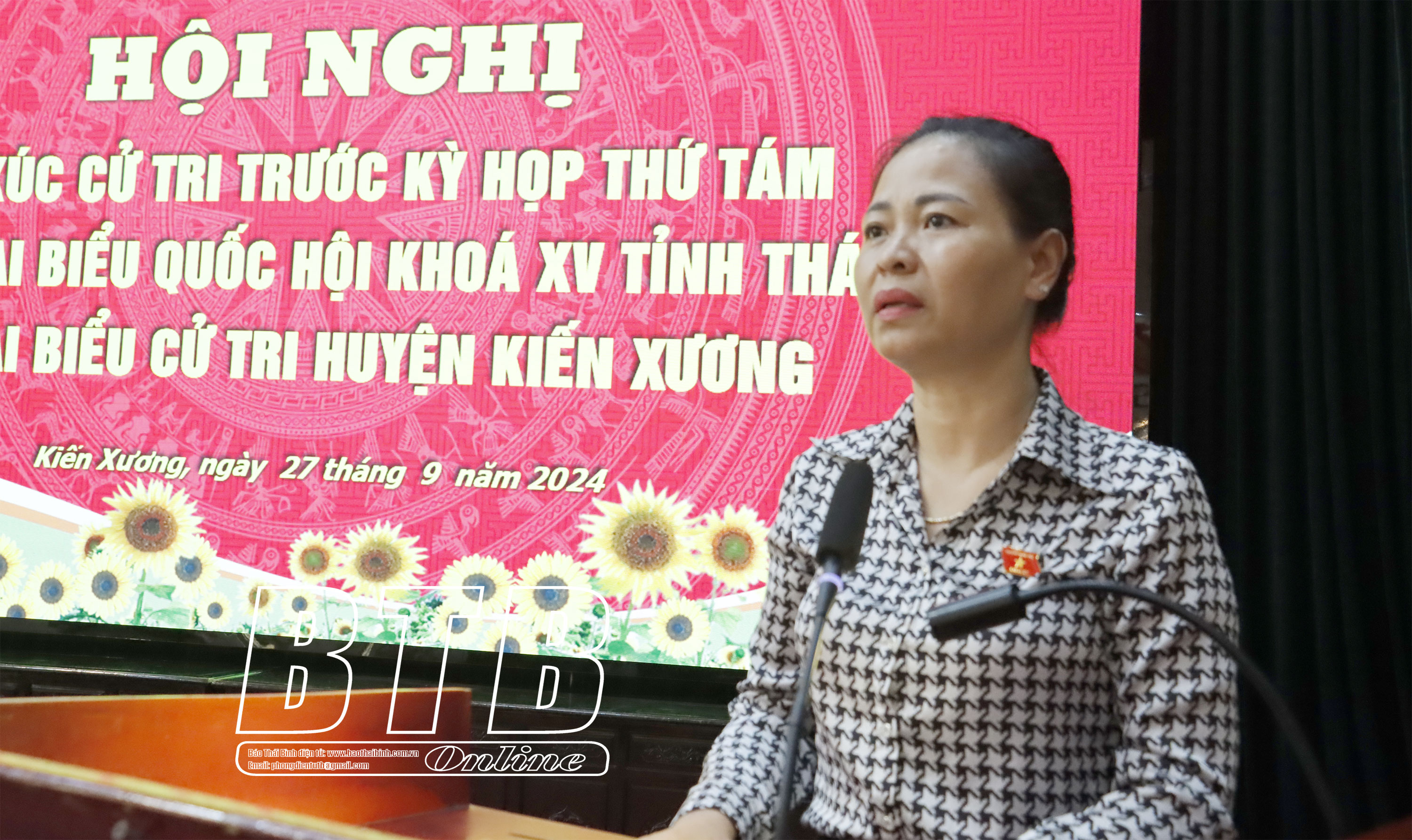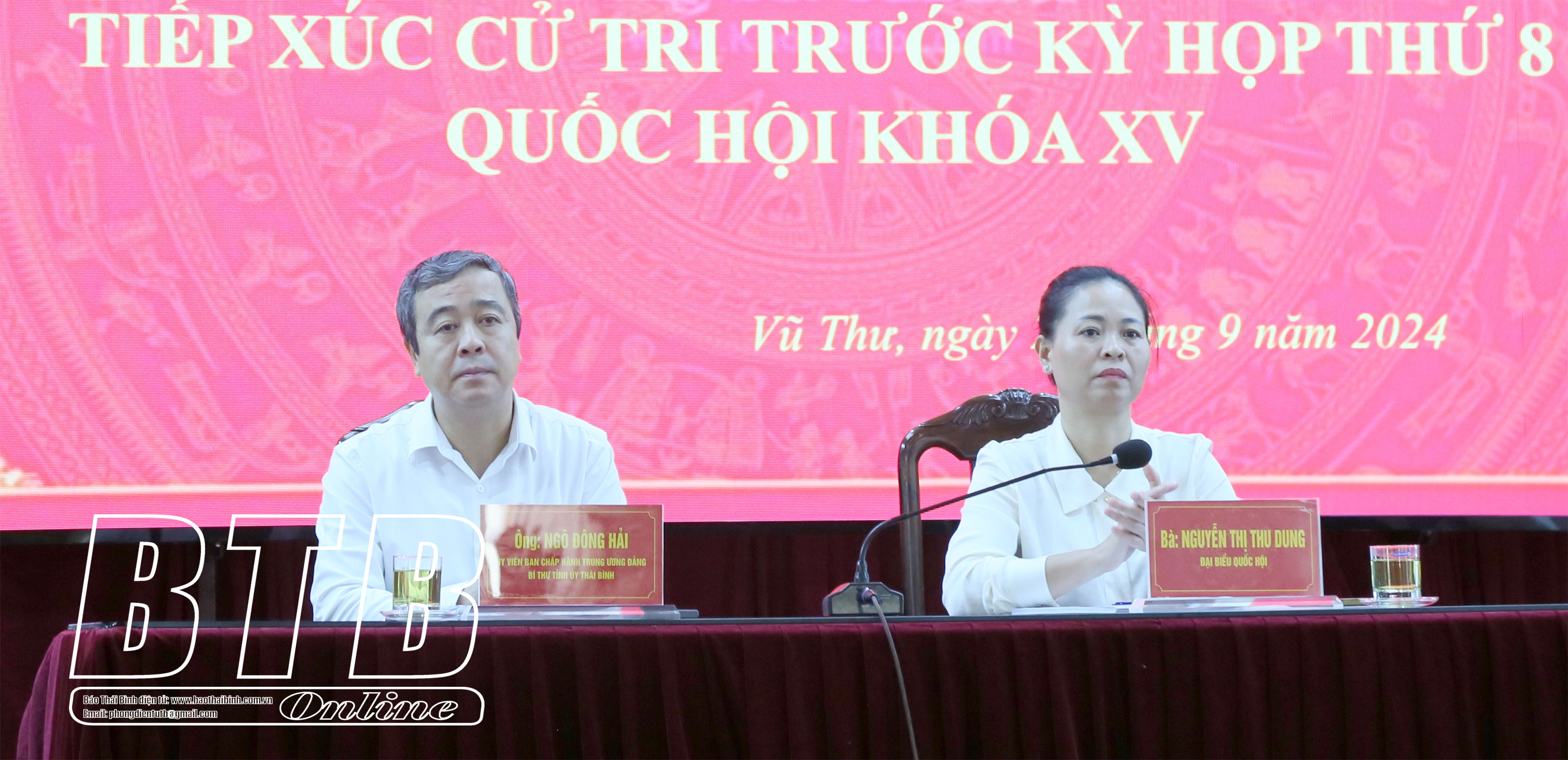 Ngày 27/9, Ủy ban MTTQ tỉnh phối hợp với Đoàn đại biểu Quốc hội tỉnh tổ chức hội nghị tiếp xúc trước kỳ họp thứ tám, Quốc hội khóa XV giữa đại biểu Quốc hội tỉnh và cử tri các huyện Vũ Thư, Kiến Xương. Các đồng chí: Ngô Đông Hải, Ủy viên Ban Chấp hành Trung ương Đảng, Bí thư Tỉnh ủy, Trưởng đoàn Đại biểu Quốc hội tỉnh; Đặng Thanh Giang, Ủy viên Ban Thường vụ Tỉnh ủy, Phó Chủ tịch thường trực HĐND tỉnh; Nguyễn Thị Thu Dung, Hiệu trưởng Trường Cao đẳng Y tế Thái Bình dự hội nghị.
