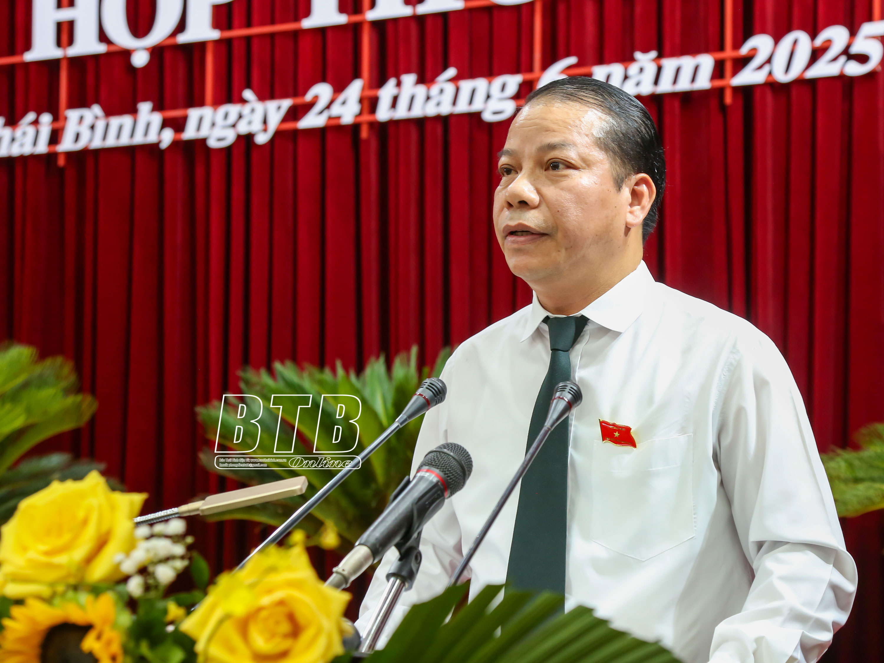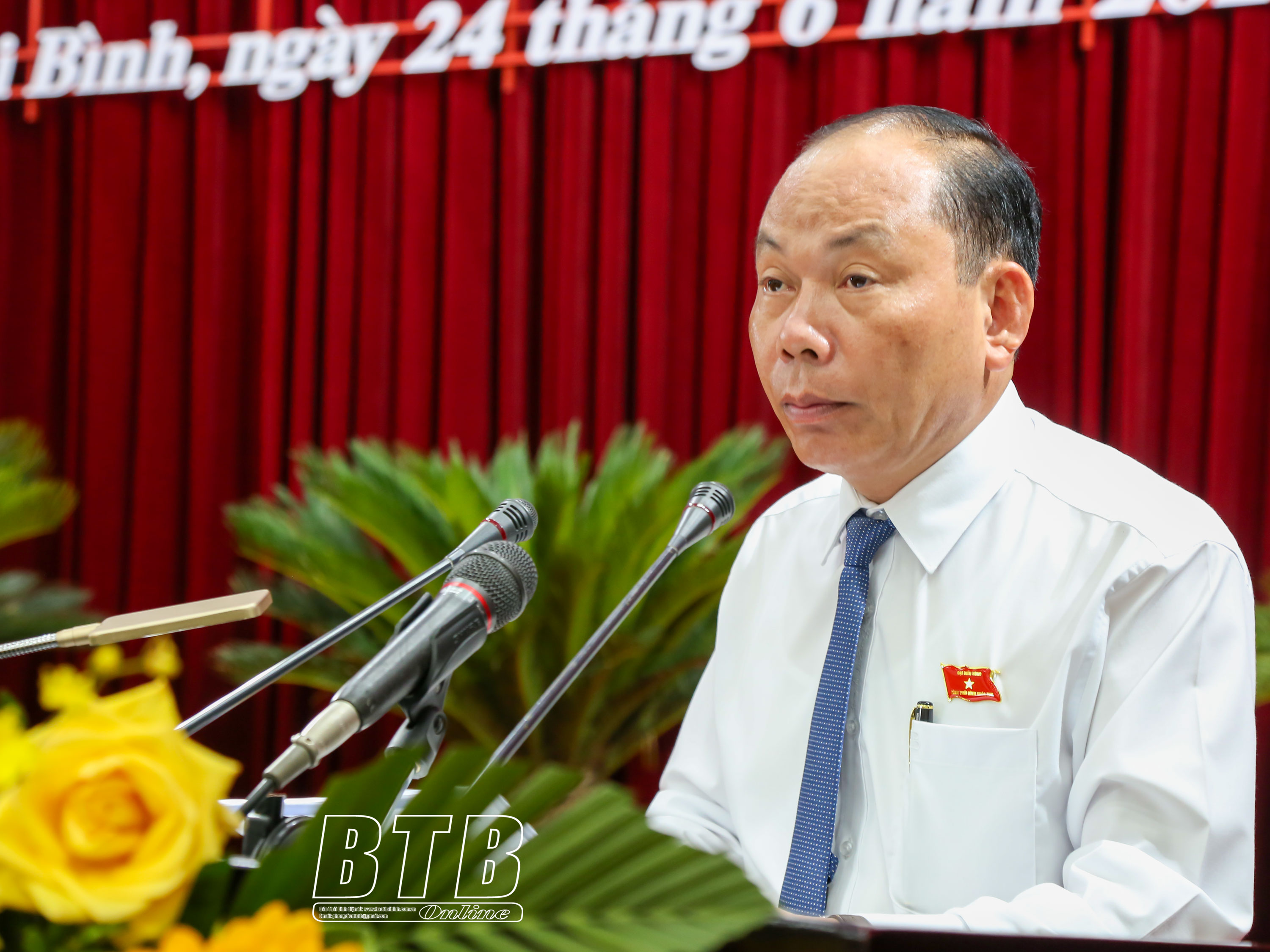 Đồng chí Phó Bí thư thường trực Tỉnh ủy, Chủ tịch HĐND tỉnh cũng nhấn mạnh đây là kỳ họp cuối cùng của HĐND tỉnh Thái Bình trước khi chuẩn bị các điều kiện để sáp nhập vào HĐND tỉnh Hưng Yên đồng thời cũng khẳng định về những kết quả hoạt động của HĐND tỉnh Thái Bình trong những năm qua đã góp phần quan trọng vào thực hiện nhiệm vụ phát triển kinh tế - xã hội, giữ vững an ninh chính trị và trật tự an toàn xã hội, củng cố quốc phòng an ninh của tỉnh. Đồng chí mong muốn mỗi cán bộ, đảng viên, mỗi cơ quan, đơn vị tiếp tục làm việc với tinh thần cống hiến, kỷ cương, trách nhiệm và tự hào, để mỗi thành quả hôm nay sẽ là nền móng vững chắc cho sự phát triển mạnh mẽ của tỉnh Hưng Yên mới mai sau; với truyền thống văn hiến, cách mạng, cùng nền tảng kinh tế - xã hội, con người, hệ thống tổ chức ổn định, sẽ cùng Hưng Yên tạo nên một đơn vị hành chính mới, mạnh mẽ, đồng bộ, lan tỏa, góp phần vào sự nghiệp phát triển của vùng đồng bằng sông Hồng và cả nước.