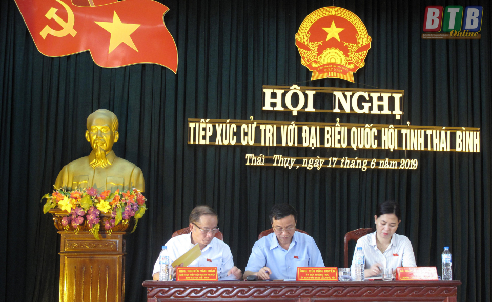 Dự hội nghị tiếp xúc có các đại biểu: Nguyễn Hạnh Phúc, Ủy viên Trung ương Đảng, Ủy viên Ủy ban Thường vụ Quốc hội, Tổng thư ký, Chủ nhiệm Văn phòng Quốc hội; Nguyễn Hồng Diên, Ủy viên Trung ương Đảng, Bí thư Tỉnh ủy, Chủ tịch HĐND tỉnh; Phạm Văn Tuân, Tỉnh ủy viên, Phó trưởng đoàn phụ trách Đoàn đại biểu Quốc hội tỉnh; Bùi Văn Xuyền, Ủy viên thường trực Ủy ban Pháp luật của Quốc hội; Nguyễn Văn Thân, Chủ tịch Hiệp hội Doanh nghiệp vừa và nhỏ Việt Nam; Vũ Tiến Lộc, Chủ tịch Phòng Thương mại và Công nghiệp Việt Nam; Bùi Quốc Phòng, Phó Chủ tịch Hội Cựu chiến binh tỉnh; Nguyễn Thị Thu Dung, Hiệu trưởng Trường Cao đẳng Y Thái Bình.