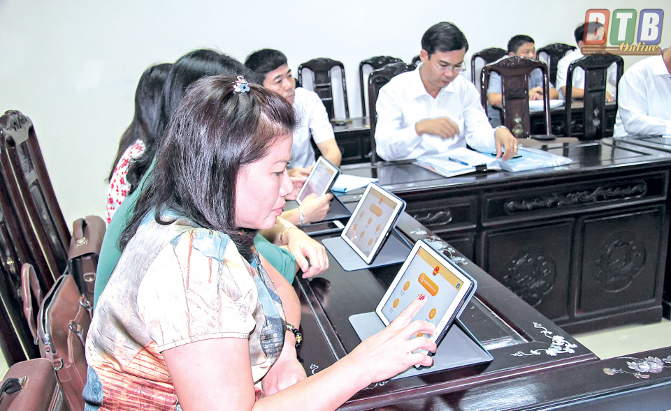 Tập huấn sử dụng phần mềm dành cho đại biểu HĐND tỉnh trên máy tính bảng. Ảnh: Thành Tâm