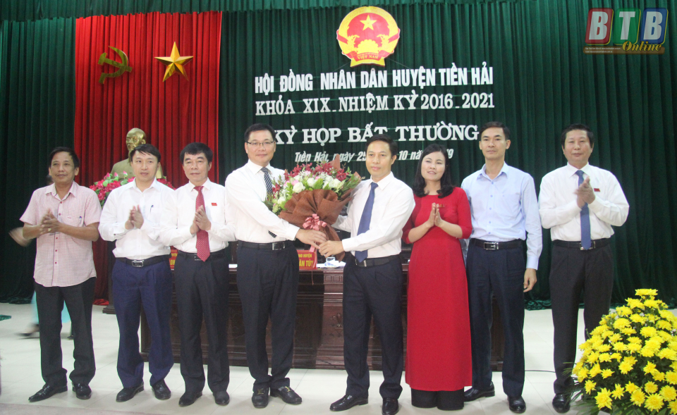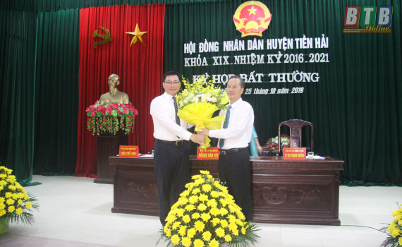 Lãnh đạo huyện Tiền Hải chúc mừng đồng chí Phạm Hồng Tùng được bầu vào chức danh Chủ tịch UBND huyện Tiền Hải