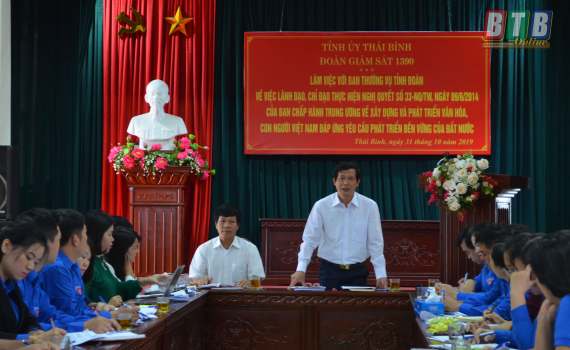 Phát biểu tại buổi giám sát, đồng chí Trưởng ban Tuyên giáo Tỉnh ủy, Tổ trưởng, Trưởng đoàn giám sát ghi nhận, đánh giá cao việc lãnh đạo, chỉ đạo thực hiện Nghị quyết số 33 trong các cấp bộ đoàn. Đồng chí đề nghị, các cấp bộ đoàn cần quán triệt sâu sắc hơn những nội dung thực Nghị quyết số 33 của Ban chấp hành Trung ương Đảng và Nghị quyết số 04 của Ban Chấp hành Đảng bộ tỉnh về tăng cường giáo dục, phát huy truyền thống văn hóa, văn hiến, yêu nước, cách mạng của quê hương Thái Bình cho cán bộ, đảng viên và các tầng lớp nhân dân. Bên cạnh đó, các cấp bộ đoàn cần sâu sát với cơ sở, nắm bắt nhu cầu, nguyện vọng của từng đối tượng thanh thiếu nhi để có giải pháp xây dựng nội dung, hình thức tuyên truyền, mô hình hoạt động phù hợp đáp ứng tâm tư, nguyện vọng cũng như trình độ nhận thức, nghề nghiệp và lứa tuổi thanh thiếu nhi; cần chọn những hoạt động, nhiệm vụ trọng tâm, then chốt để triển khai, tránh dàn trải để tạo sức lan tỏa, sự thẩm thấu và nâng cao hiệu quả của các phong trào, hoạt động…
