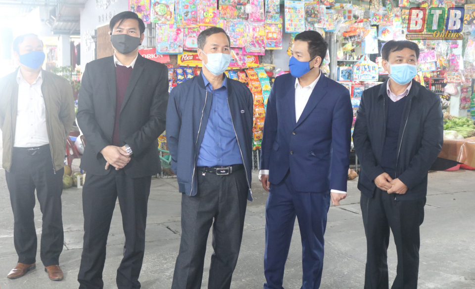 Đồng chí Đàm Văn Vượng, Ủy viên Ban Thường vụ Tỉnh ủy, Phó Chủ tịch thường trực HĐND tỉnh cùng lãnh đạo Huyện ủy Đông Hưng kiểm tra công tác phòng chống dịch bệnh tại chợ Thị trấn Đông Hưng.