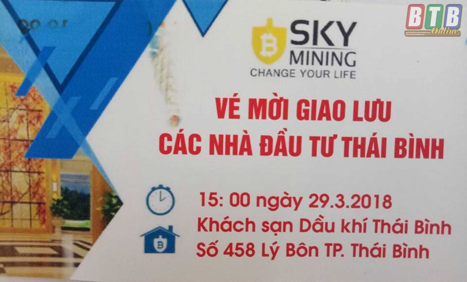 Vừa qua, trên địa bàn tỉnh, Công ty TNHH Sky Mining đã tổ chức buổi giao lưu với sự tham gia của gần 200 nhà đầu tư đến từ Thái Bình và một số tỉnh lân cận. Công ty Sky Mining được thành lập vào cuối tháng 9/2017 với hai trụ sở chính tại quận Phú Nhuận (thành phố Hồ Chí Minh) và quận Thanh Xuân (thành phố Hà Nội) với ngành nghề kinh doanh chính là xuất bản phần mềm.
