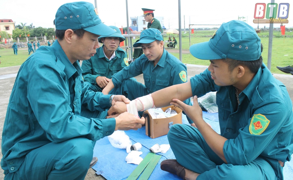 Chiến sĩ dân quân tự vệ tham gia kiểm tra nội dung kỹ thuật băng bó vết thương.