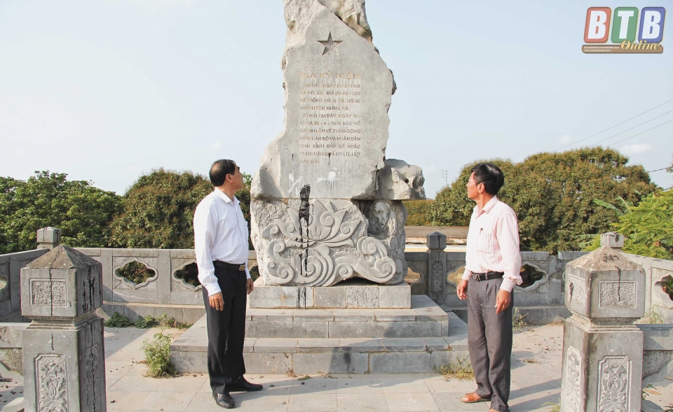 Người dân lập bia di tích Bác Hồ về thăm Hồng An năm 1946.