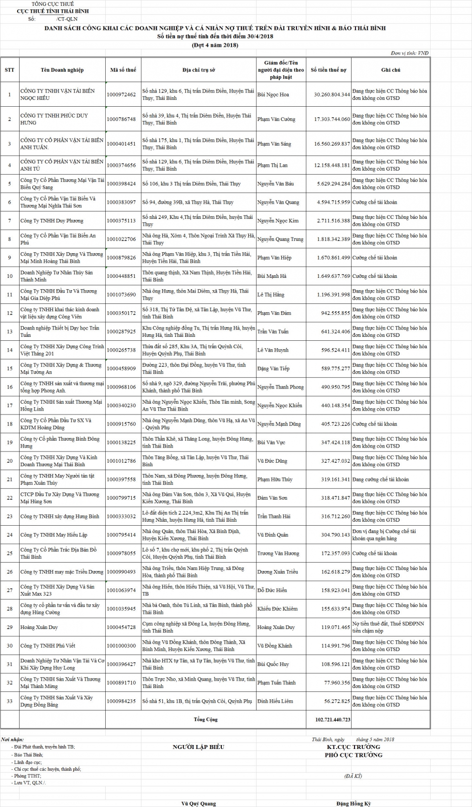 Danh sách các doanh nghiệp và cá nhân nợ thuế tính đến thời điểm 30/4/2018 (Đợt 4 năm 2018)