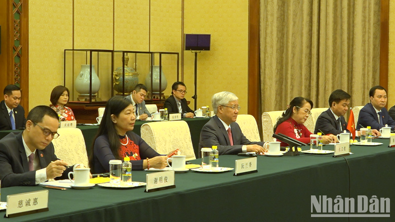 Đoàn đại biểu Mặt trận Tổ quốc Việt Nam làm việc với Chính hiệp thành phố Bắc Kinh. (Ảnh: HỒ QUÂN).