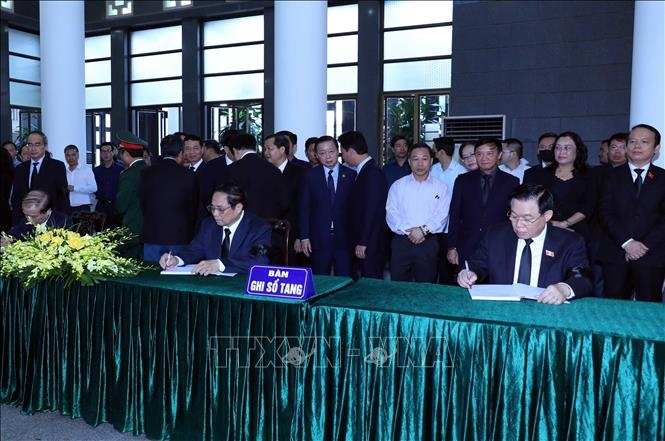 Chủ tịch Quốc hội Vương Đình Huệ và Thủ tướng Chính phủ Phạm Minh Chính ghi sổ tang. Ảnh: TTXVN.