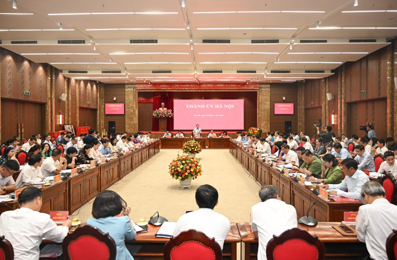 Quang cảnh buổi làm việc với Ban Thường vụ Thành ủy Hà Nội. (Ảnh: DUY LINH).