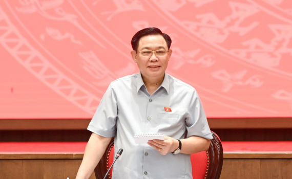 Chủ tịch Quốc hội Vương Đình Huệ phát biểu tại buổi làm việc với Ban Thường vụ Thành ủy Hà Nội. (Ảnh DUY LINH).
